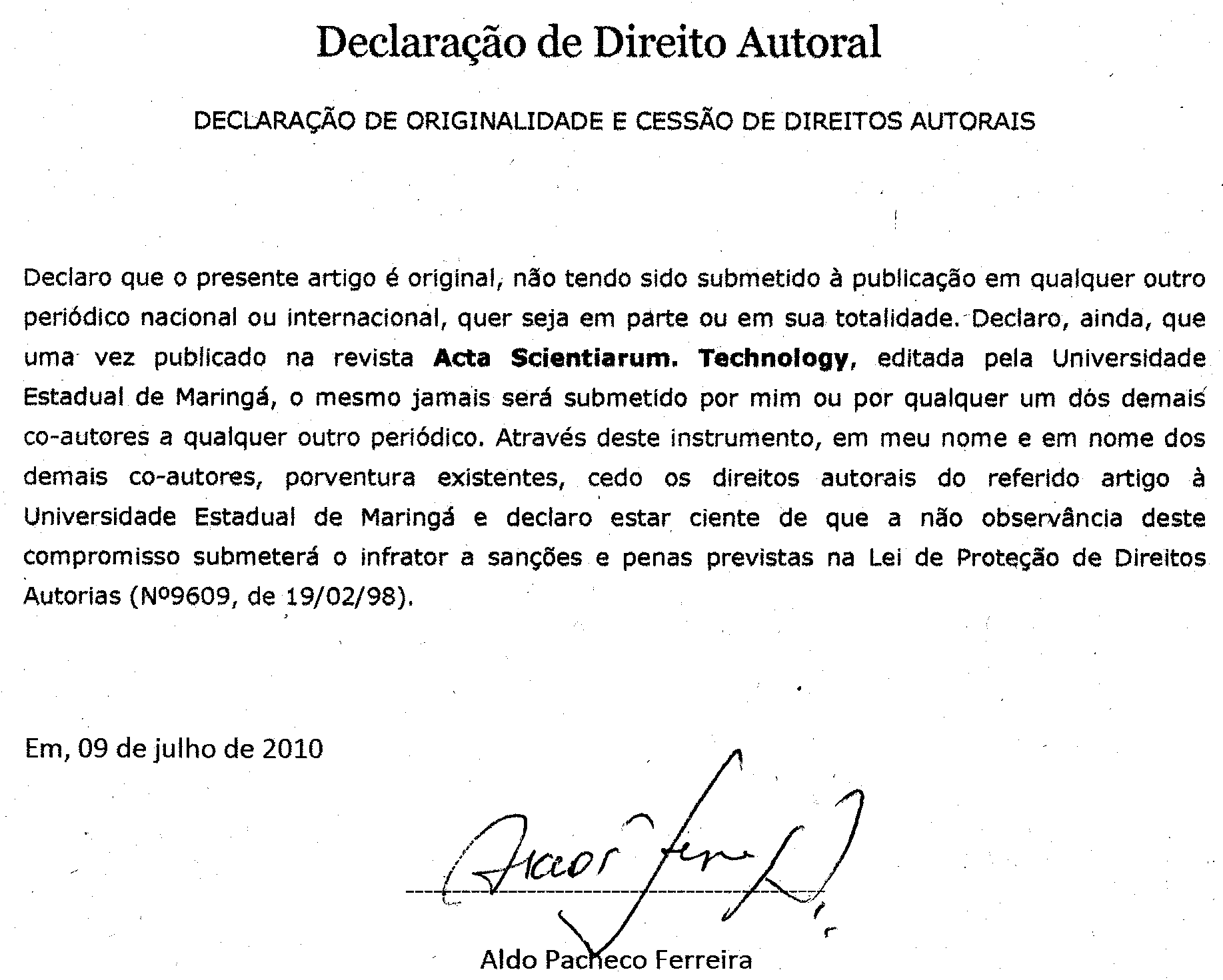 Declaro que o presente artigo é original, não tendo sido submetido í publicação em qualquer outro periódico nacional ou internacional, quer seja em parte ou em sua totalidade.