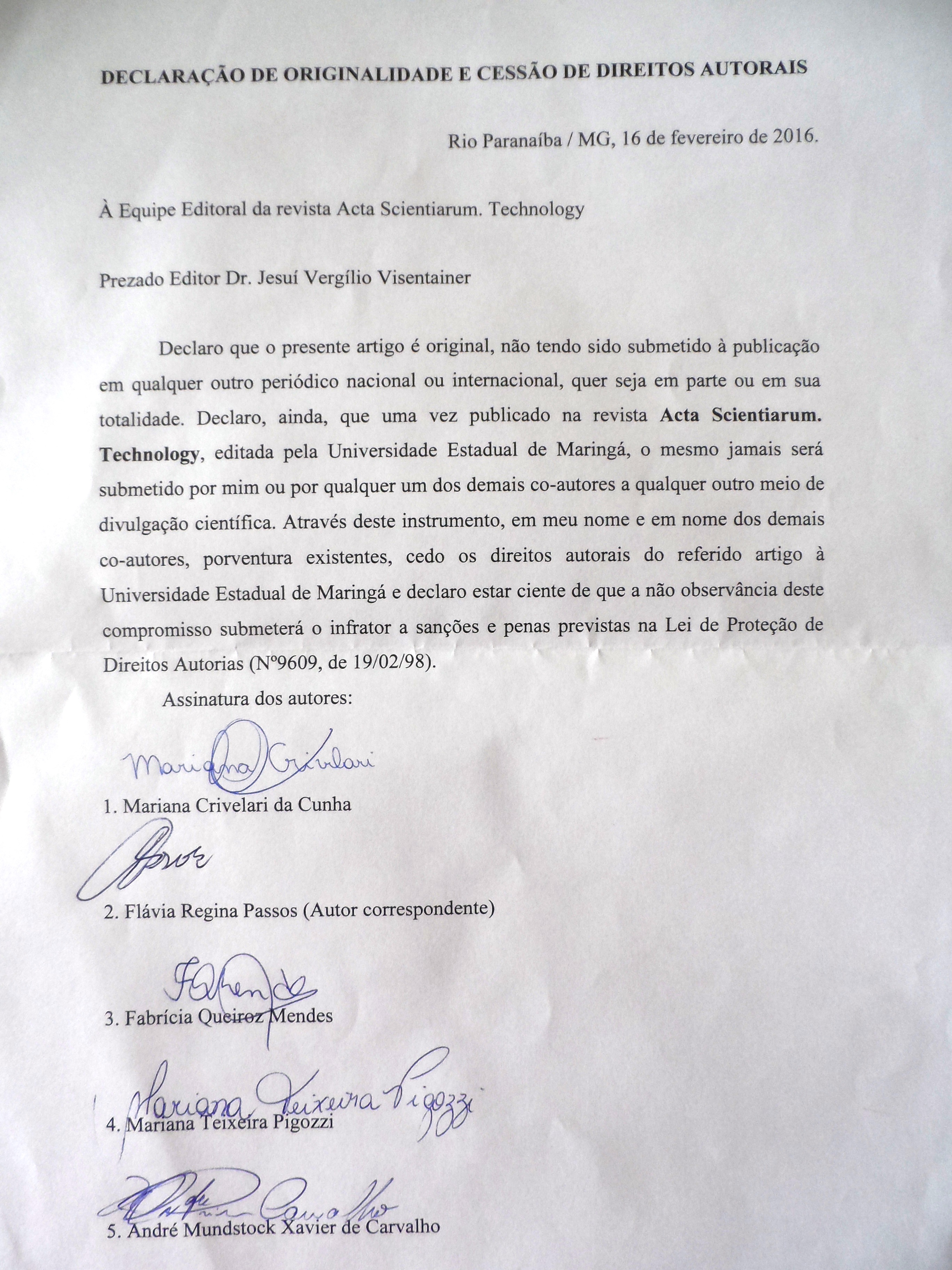 Declaro que o presente artigo é original, não tendo sido submetido í publicação em qualquer outro periódico nacional ou internacional, quer seja em parte ou em sua totalidade.