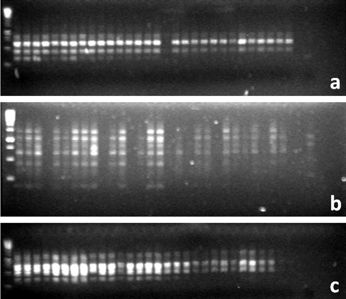 The species Caesalpinia pulcherrima, which belongs to the Fabaceae family, is frequently used as a hedge or street tree in urban landscapes, parks and gardens. It flowers profusely, and the flowers, depending on the variety, may be pink, orange or yellow. As flower characteristics are essential for determining the commercial value of ornamental species, the main objective of this work was to identify polymorphisms in C. pulcherrima plants that produce flowers of different colors using RAPD molecular markers. For this study, 30 adult plants were randomly chosen on streets located in Jaboticabal city, São Paulo State, Brazil, and leaf samples were collected for DNA extraction. Among these trees, 20 have orange flowers, eight have yellow flowers and only two produce pink flowers. From the 140 tested RAPD primers, 94 primers amplified defined fragments that resulted in 246 bands, which were 100% monomorphic. Thus, a polymorphism was not detected by any of the primers tested. It was concluded that the RAPD technique is not an efficient method for detecting polymorphisms and that more specific molecular markers should be tested. Additionally, the morphological characteristic “flower color” may be controlled by several genes or by the association of them.