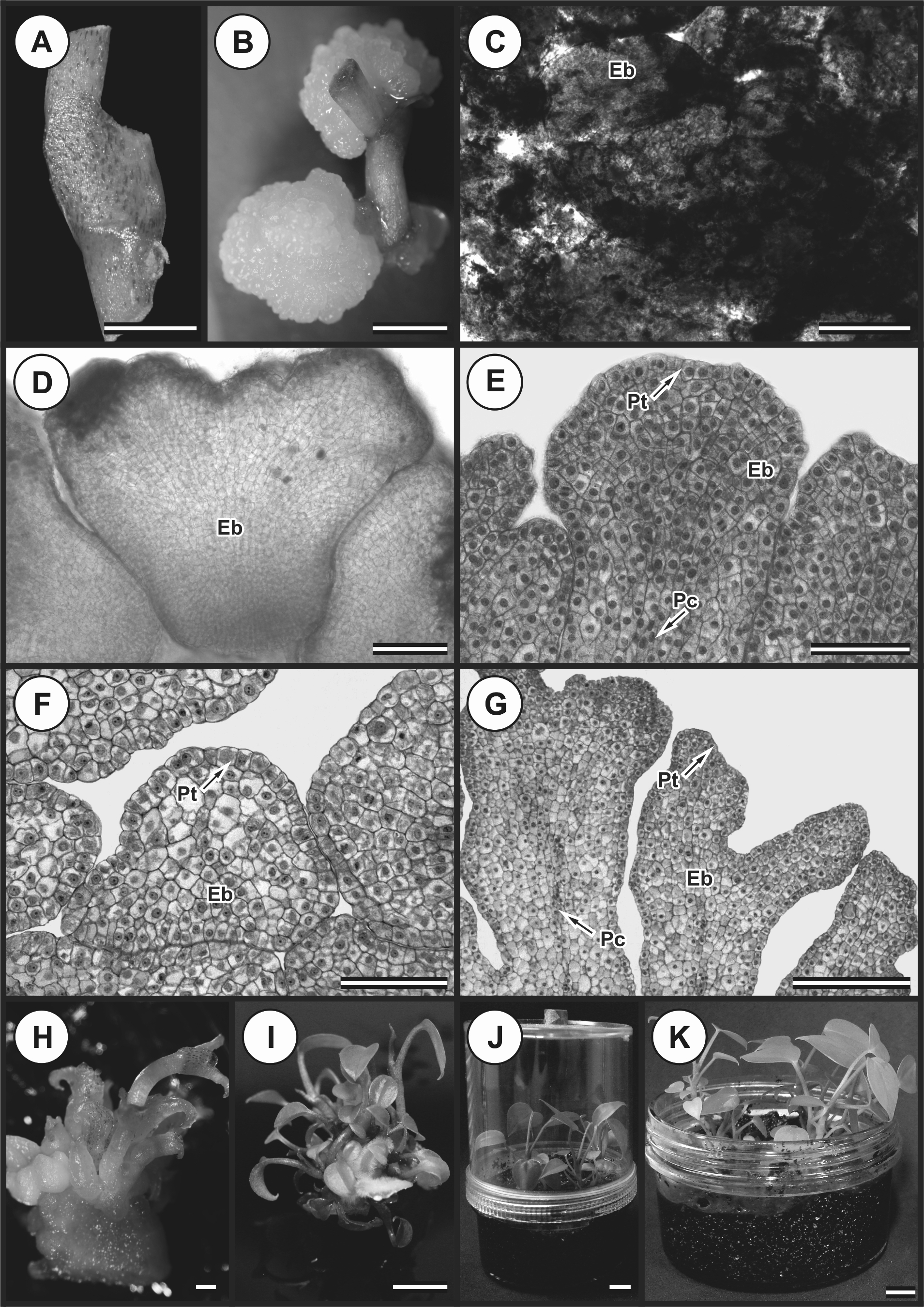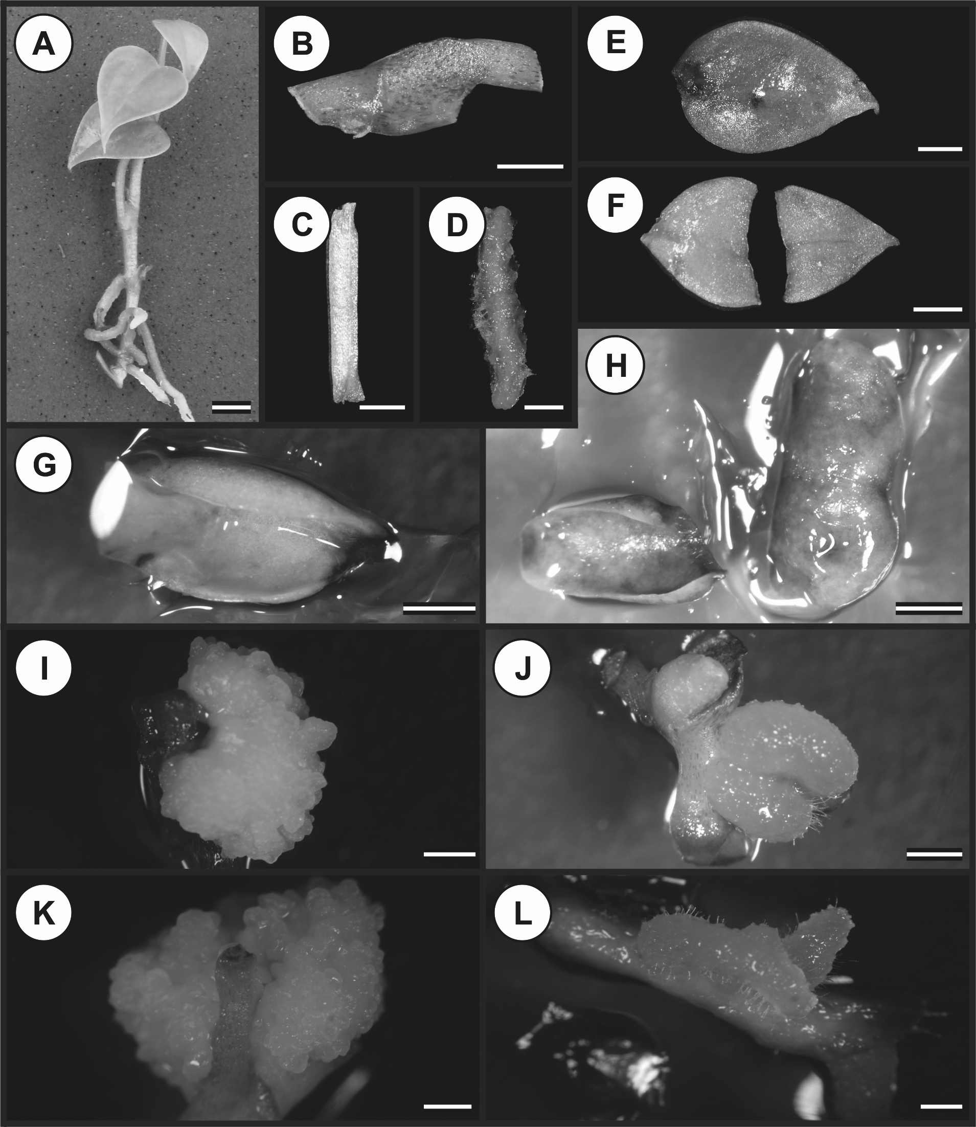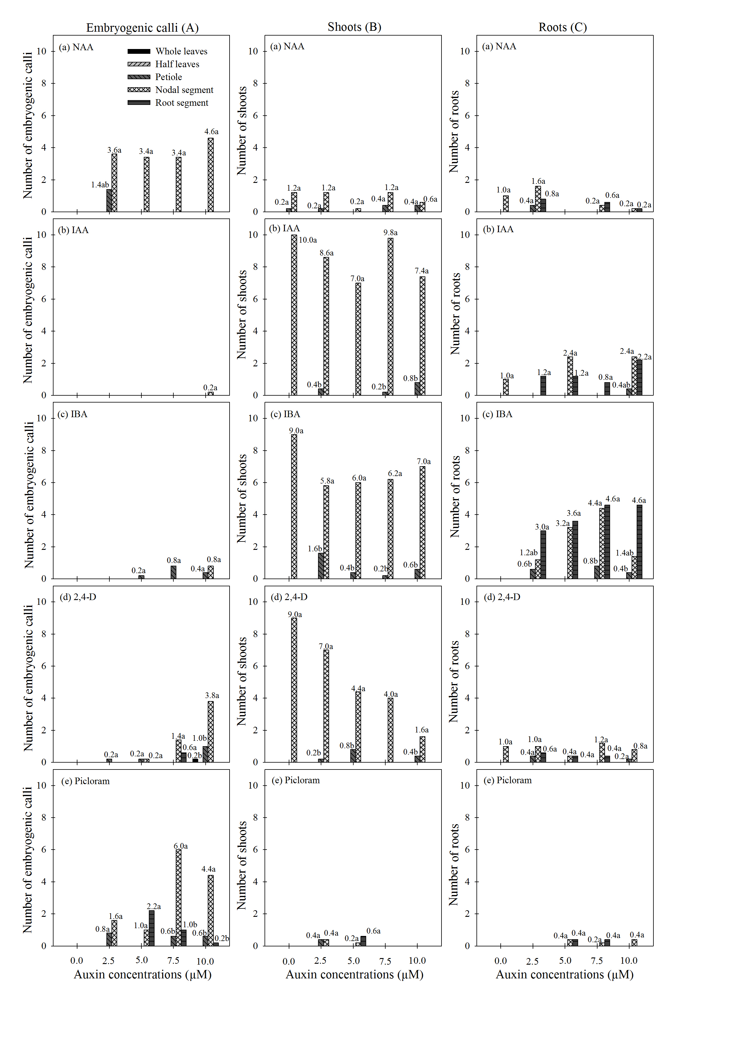 This study establishes a protocol for the induction of somatic embryogenesis in Anthurium andraeanum cv. Eidibel. The experiment was arranged in a completely randomized 5 x 5 x 5 factorial design using five explant types (whole leaves, half leaves; petiole; nodal segments and root segments) from in vitro plantlets; five auxins: indole-3-acetic acid (IAA), α-naphthaleneacetic acid (NAA), indole-3-butyric acid (IBA), 2,4-dichlorophenoxyacetic acid (2,4-D), and 4-amino-3,5,6-trichloropicolinic acid (Picloram); at five concentrations (0, 2.5, 5, 7.5 and 10 µM), with five replications using five Petri dishes. The cultures were maintained in a growth room at 25 ± 2ºC in the dark. The explant type was investigated for the induction of somatic embryogenesis in anthurium cv. Eidibel, and nodal segments were shown to be the most suitable explant for this process. After 60 days in culture, the highest number of embryogenic calli was recorded for the nodal segments cultured in NAA (5, 7.5 and 10 µM), 2,4-D (10 µM) and Picloram (7.5 and 10 µM). The histological analysis confirmed the presence of embryos with established polarization, procambium, ground meristem and protoderm in the nodal segments cultured in Pierik medium containing 10 µM NAA. After the conversion of the somatic embryos into plantlets, these plantlets were acclimatized transferred to in vivo conditions and grown into normal plants.