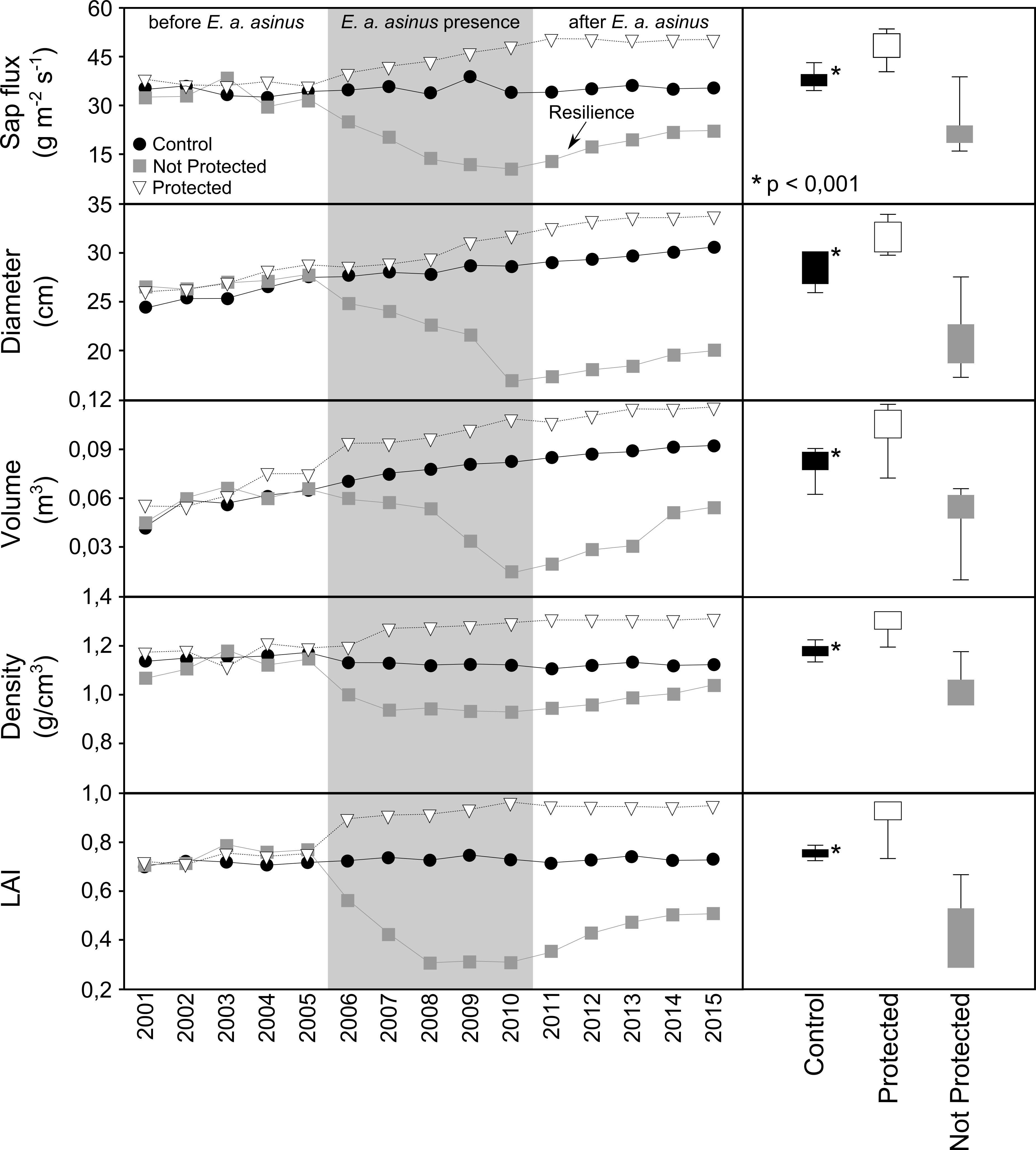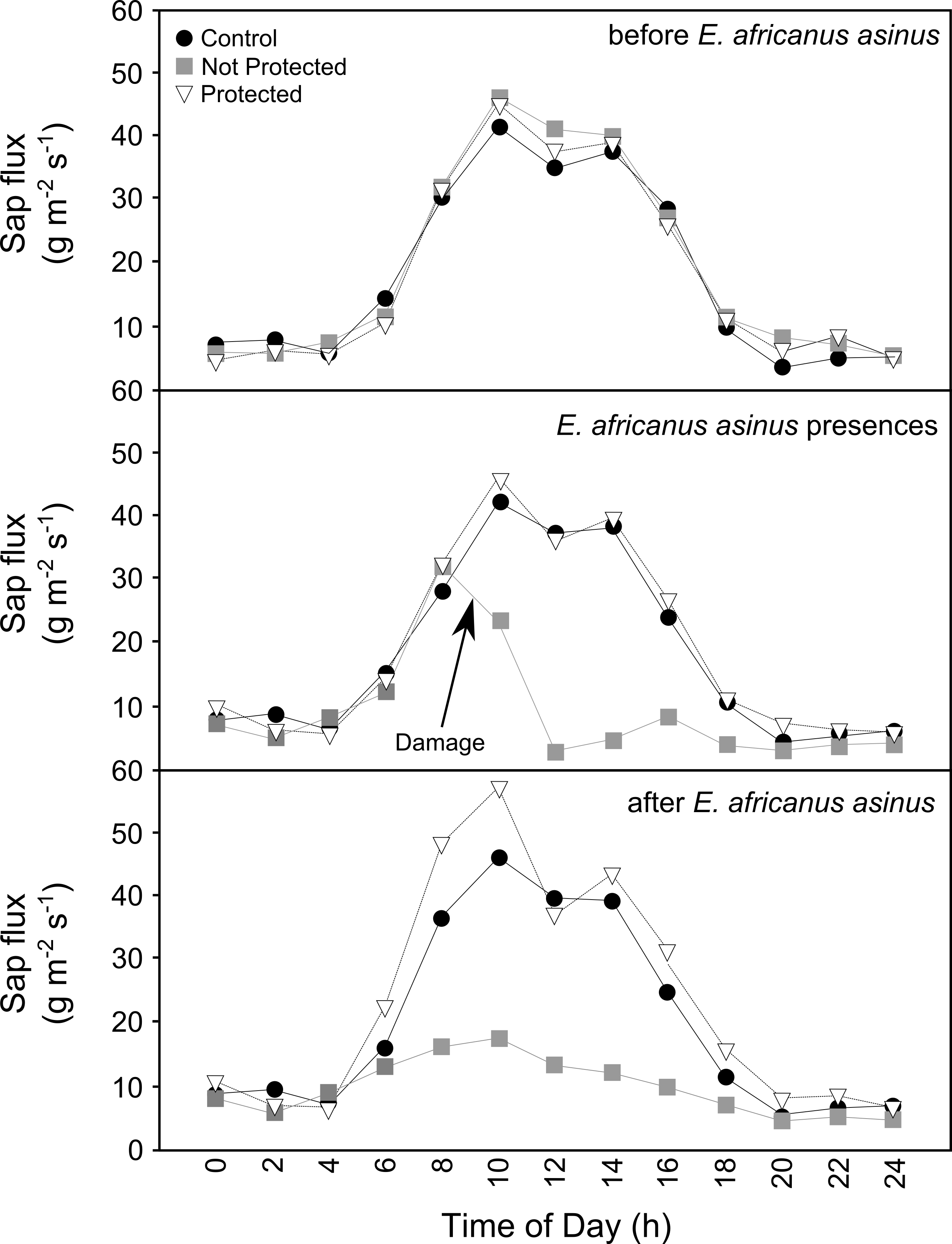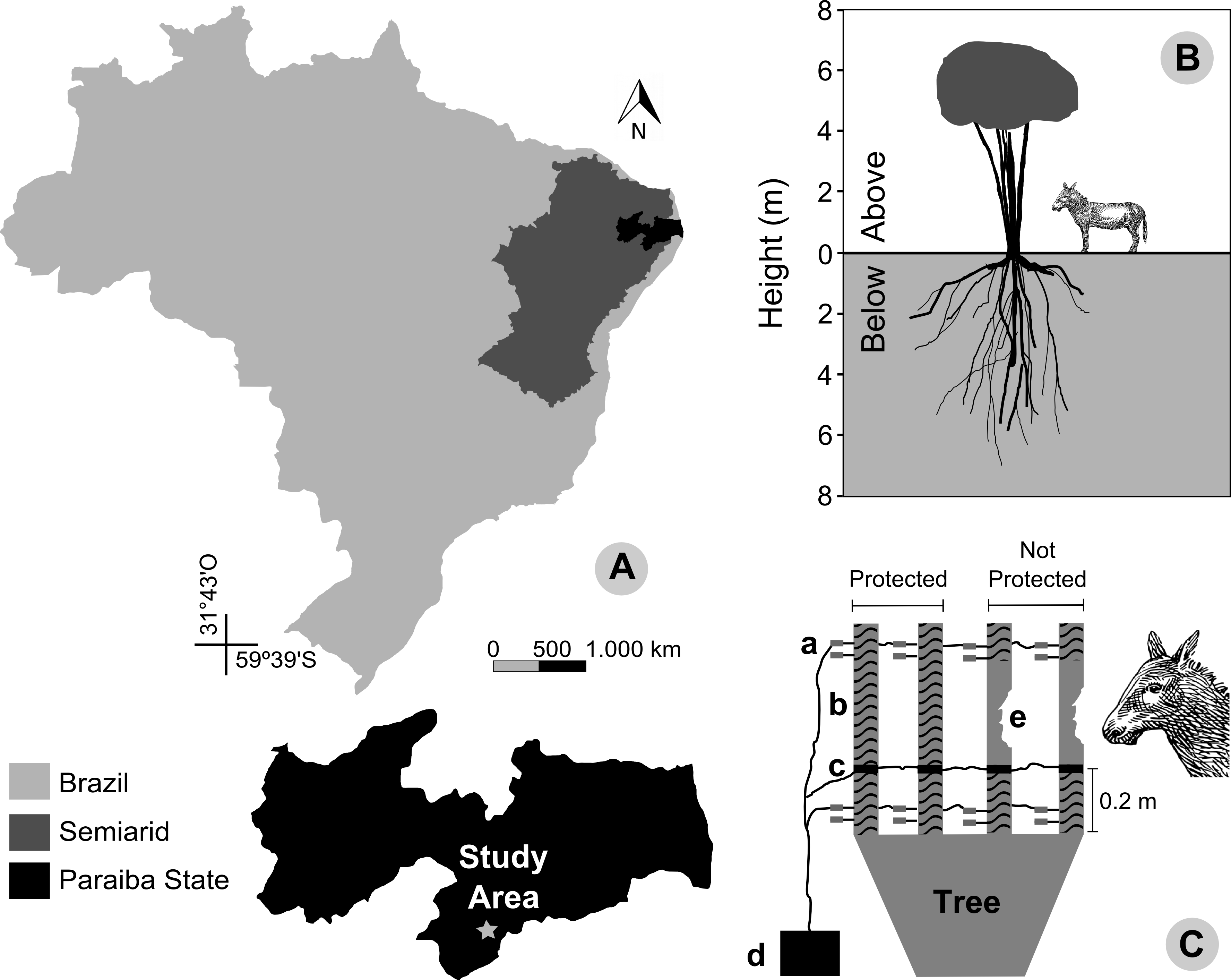 The increase in Equus africanus asinus Linnaeus population in semiarid areas of Northeast Brazil had significant impacts on wild and rural areas. The objective of this work was to analyze the herbivory of E. africanus asinus on Poincianella pyramidalis (Tul). L.P. Queiroz and determine the dendrophysiological strategies P. pyramidalis used during and after damage caused by E. africanus asinus. The selected areas have significant populations of P. pyramidalis with amplified importance value higher than 50%. Two areas were established: one control and another experimental, with presence of E. africanus asinus. The study was carried out from 2001 to 2015. The evaluated variables of P. pyramidalis were: sap flow, basic density, diameter, volume, biomass and leaf area index. The increase of abandoned E. africanus asinus in semiarid areas resulted in impact and responses from P. pyramidalis. This plant species compensates for biomass losses and physiological activities reduction with two strategies: i) increase in the belowground biomass stock, and ii) increase in sap flow in undisturbed branches.