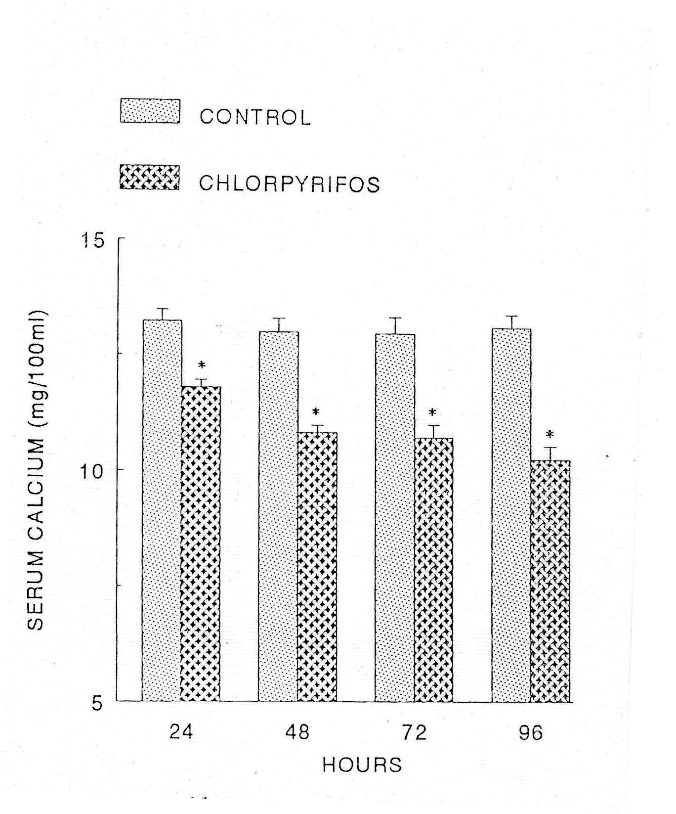 - Figure 1. Serum calcium levels of short-term chlorpyrifos treated Heteropneustes fossilis. Values are mean ± S.E. of six specimens. Asterisk indicates significant differences (P<0.05) from control.