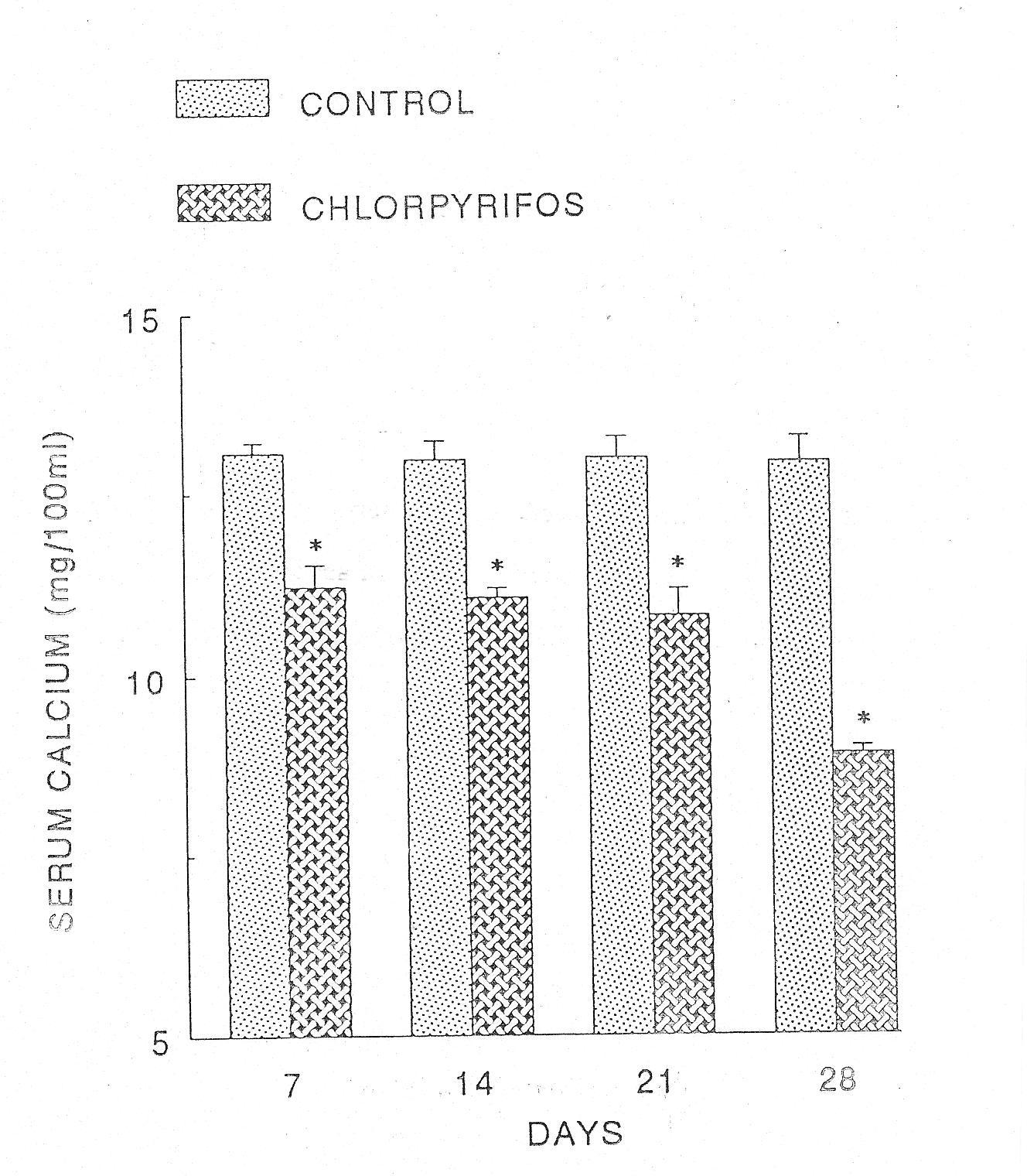 - Figure 2. Serum calcium levels of long-term chlorpyrifos treated Heteropneustes fossilis. Values are mean ± S.E. of six specimens. Asterisk indicates significant differences (P<0.05) from control.