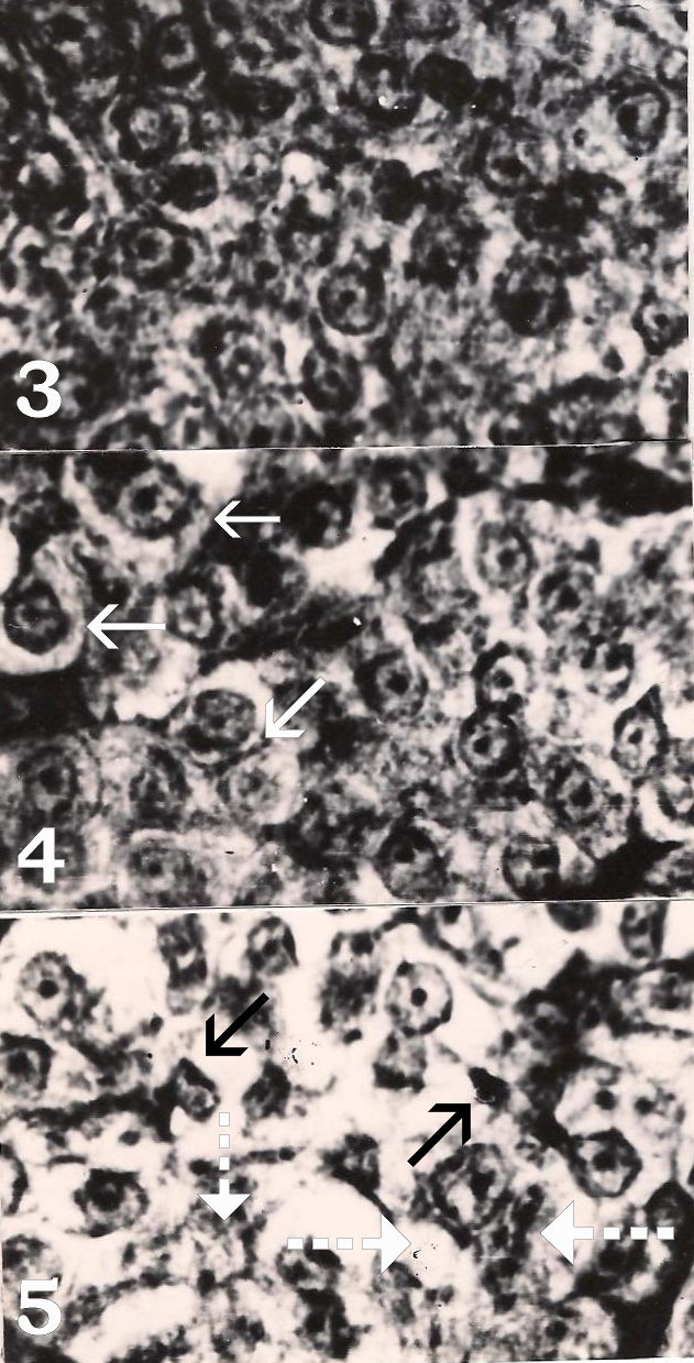 - Figure 5. Prolactin cells of 28 days chlorpyrifos exposed fish showing degeneration (arrows). Note vacuolization and cytolysis (white broken arrows) at some places. Herlant tetrachrome X 800.