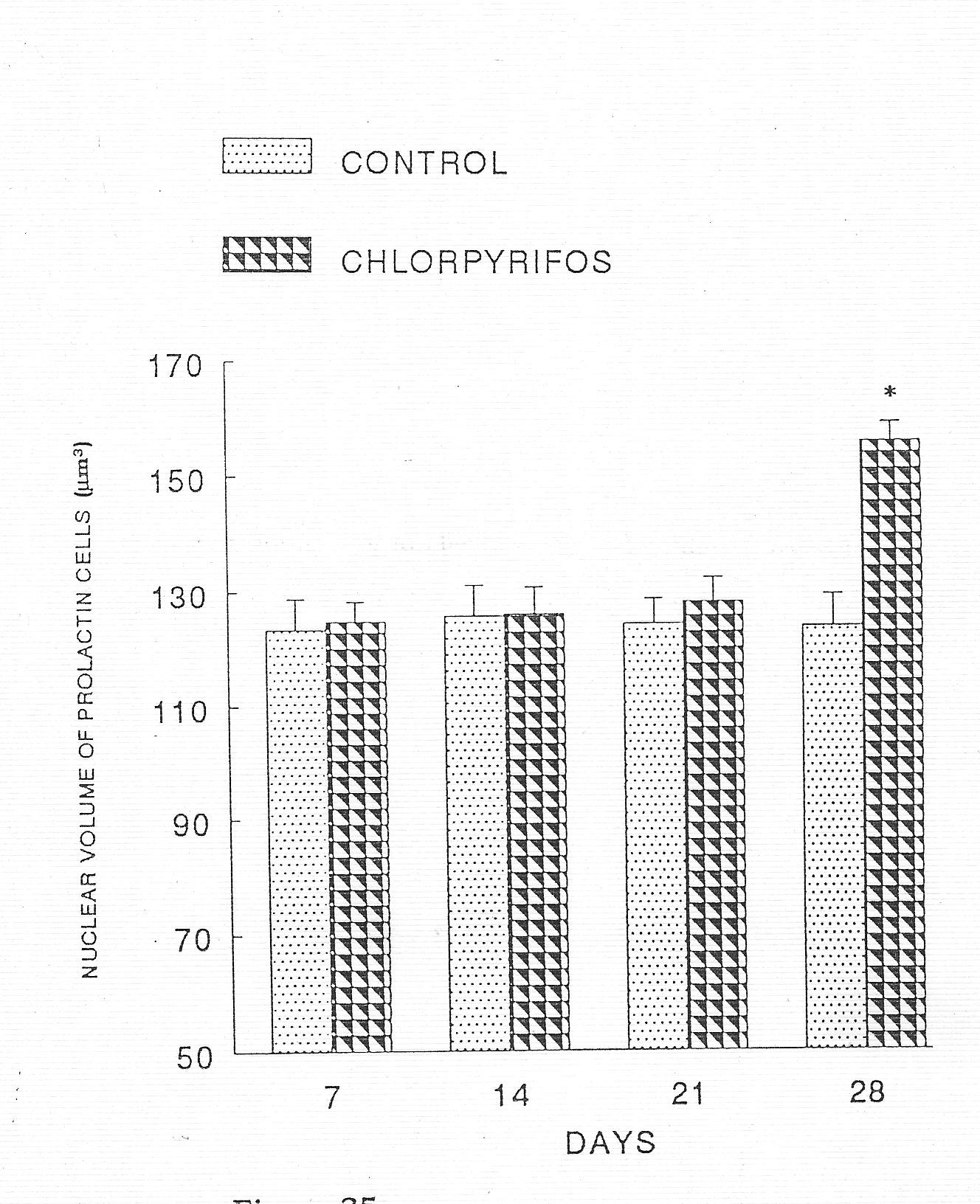 - Figure 6. Nuclear volume of prolactin cells of long-term chlorpyrifos exposed Heteropneustes fossilis. Each value represents mean ± S.E. of six specimens. Asterisk indicates significant differences (P<0.05) from control