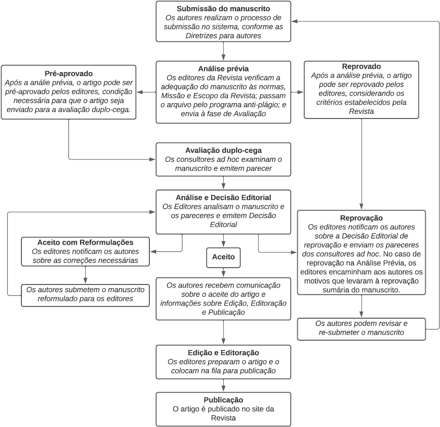 Após a verificação pela equipe editorial da adequação do manuscrito ao foco e ao escopo da Revista e do atendimento às normas informadas no site, os artigos são avaliados, aplicando-se o processo duplo-cego.