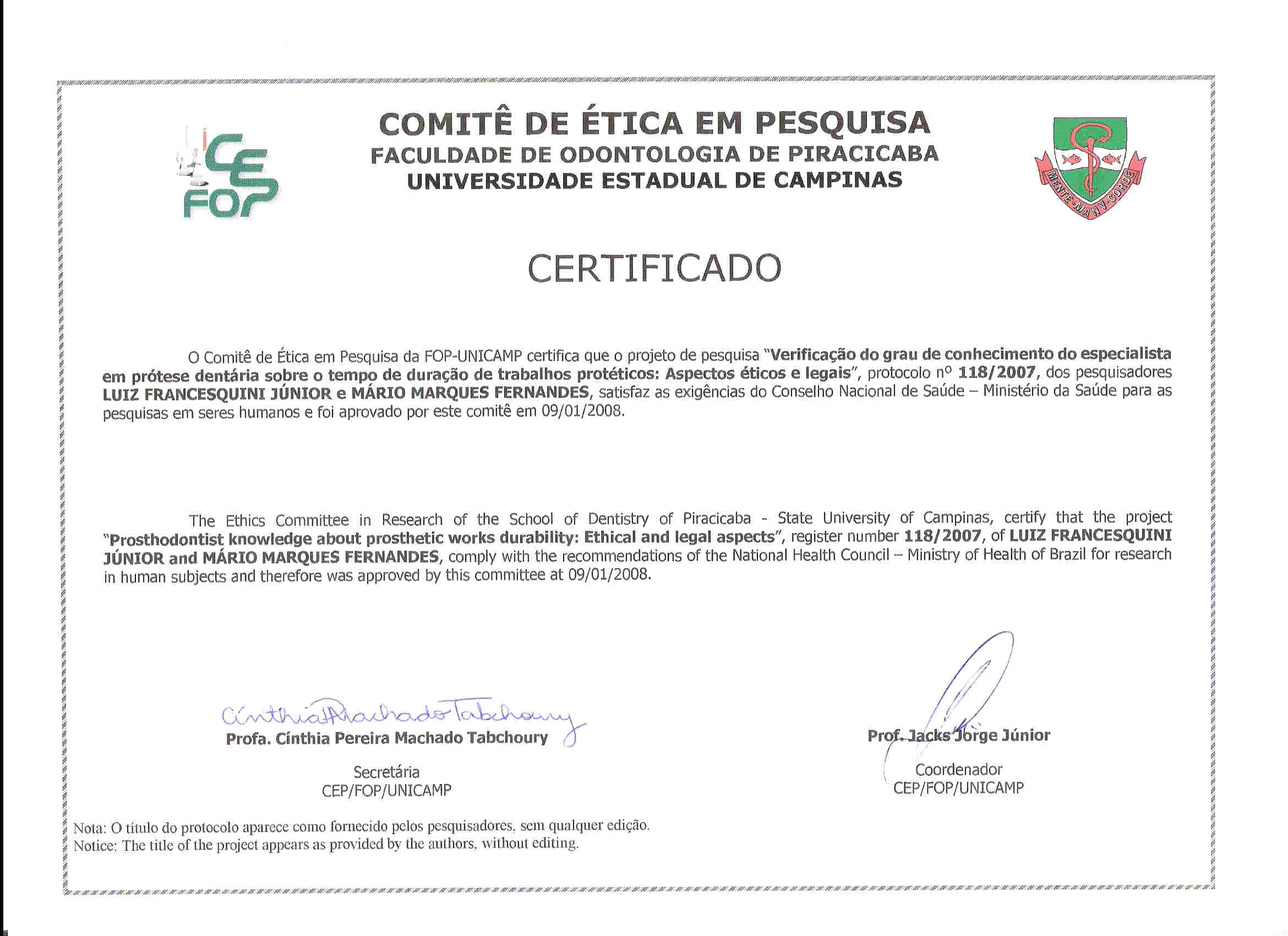 This aim of this study was to verify the level of knowledge of prosthodontics specialists from the city of Porto Alegre, Rio Grande do Sul State, concerning the failures of prosthetic works, and to provide a reflection on the type of responsibility assumed by the prosthodontist during the dental treatment. This was a descriptive cross-sectional study with a non-probabilistic sample, conducted through questionnaires with closed and open questions. The data was analyzed using the Fisher’s Exact Test (p value < or = 0.005). The sample consisted of 143 questionnaires. The statistical analysis evidenced that the dentists with up to 15 years of professional practice assign the responsibility of failures most often to the laboratory (p = 0.001) and to the patient (p = 0.021), but over the years this trend is reversed. The prosthodontists included in the study proved to have an adequate knowledge of issues that pervade the failures in the prosthodontics specialty. In relation to the parameters of the professional responsibility, it is necessary to consider the type of duty assumed by the prosthodontist as for the responsibility of means.