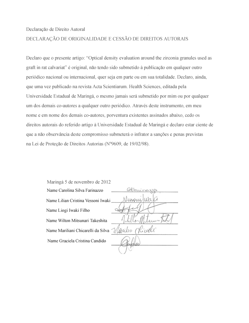 Declaro que o presente artigo é original, não tendo sido submetido à publicação em qualquer outro periódico nacional ou internacional, quer seja em parte ou em sua totalidade.