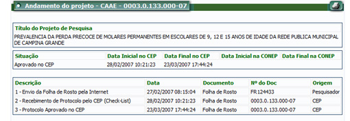 Este estudo avaliou a perda precoce de molares permanentes em escolares da rede pública de Campina Grande, Estado da Paraíba, com idades de nove, 12 e 15 anos. A amostra compreendeu 873 escolares, aleatoriamente selecionados. O instrumento de coleta consistiu de um questionário e de uma ficha clínica. As variáveis do estudo compreenderam os aspectos relativos à perda dentária (tipo de elemento dental, localização na arcada dentária e a região do arco), à prevenção e à autopercepção em saúde bucal. A análise estatística compreendeu a distribuição de frequências e os testes do Qui-quadrado e Exato de Fisher. Os resultados revelaram a prevalência de 17,2% de perda dentária, sem diferenças entre os sexos, frequência de escovação e palestra educativa (p > 0,05). Os elementos dentários 36 (42,5%) e 46 (33,9%) foram os mais frequentemente perdidos. Observou-se a associação positiva entre perda dentária e as variáveis idade, visita ao cirurgião-dentista (OR = 2,19; IC95%: 1,35-3,59), satisfação com o sorriso (OR = 0,40; IC95%: 0,24-0,65) e a dificuldade na mastigação (OR = 2,16; IC95%: 1,48-3,16). Conclui-se que a prevalência da perda precoce de molares permanentes foi elevada, sendo necessária a imediata adoção de ações curativas a fim de reduzir a perda precoce desses elementos dentários.Downloads