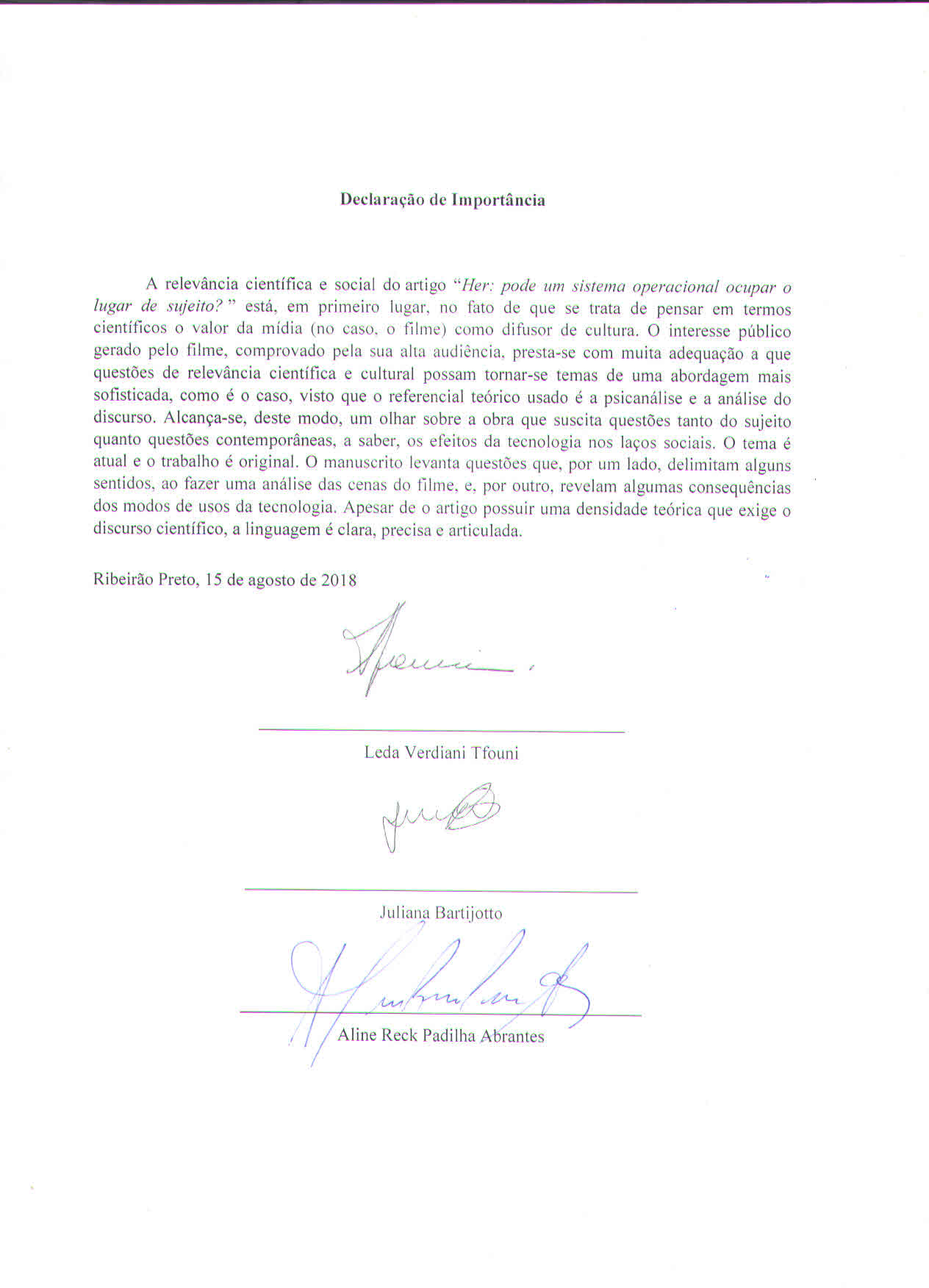 Declaro que o presente artigo é original, não tendo sido submetido à publicação em qualquer outro periódico nacional ou internacional, quer seja em parte ou em sua totalidade.