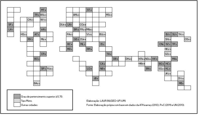 O trabalho destaca a importância das abordagens empíricas nos estudos sobre as principais cidades do mundo, demonstrando os avanços presentes na literatura recente e, também, as principais limitações das publicações que exploram o tema. Após isso, apresenta uma análise empírica com base em métodos estatísticos multivariados para a definição de agrupamentos de cidades (Fuzzy). A análise é realizada com base nos dados disponibilizados por ATKearney (2008; 2010; 2012), além de informações sobre o contingente demográfico (ORGANIZAÇÃO DAS NAÇÕES UNIDAS, 2013) e o nível de riqueza (PwC, 2011). O modelo aponta a existência de cinco tipos de agrupamentos que, conforme suas características foram denominados de Grandes Centros Consolidados, Centros Consolidados, Grandes Centros Emergentes, Centros Emergentes e Centros Marginais. A tríade “Nova Iorque, Londres e Tóquio” parece dar lugar a uma nova realidade marcada pela formação de três grandes eixos de comando, com a participação imediata de outros centros com funções relevantes na hierarquia urbana global. Ainda, os maiores países em desenvolvimento se destacam pela presença de Grandes Centros Emergentes, enquanto os Centros Emergentes e Centros Marginais estão concentrados, sobretudo, nos países do hemisfério Sul.
