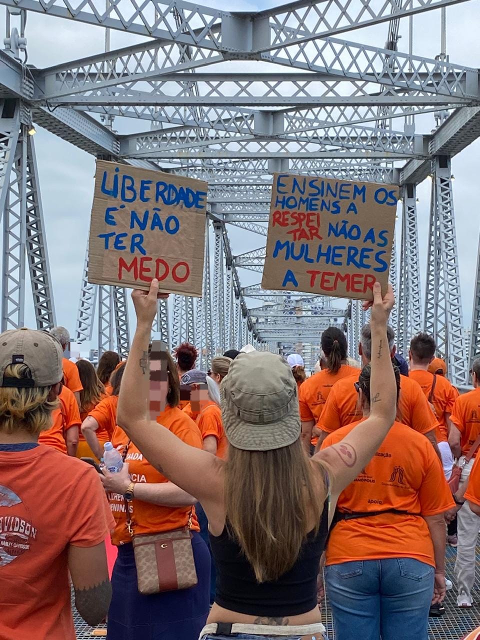 A Caminhada pelo Fim da Violência contra Mulheres e Meninas tomou as ruas de diversas capitais brasileiras no final de novembro de 2025, período em que os noticiários transbordavam casos graves que se somam à epidemia de feminicídios no país. A fotografia revela um fragmento dessa mobilização em Florianópolis, Santa Catarina. Sob a histórica ponte Hercílio Luz, uma passeata se desenha como corrente viva de resistência, trazendo mensagens de protesto que clamam por liberdade, dignidade e direitos garantidos para todas as mulheres e meninas. Em destaque, o cartaz com a frase “Ensinem os homens a respeitar” ergue-se como um chamado urgente à educação para a equidade de gênero, uma convocação para que os homens também assumam sua responsabilidade na construção de uma sociedade livre do machismo, atuando na promoção de masculinidades pautadas no respeito, no cuidado e na empatia.