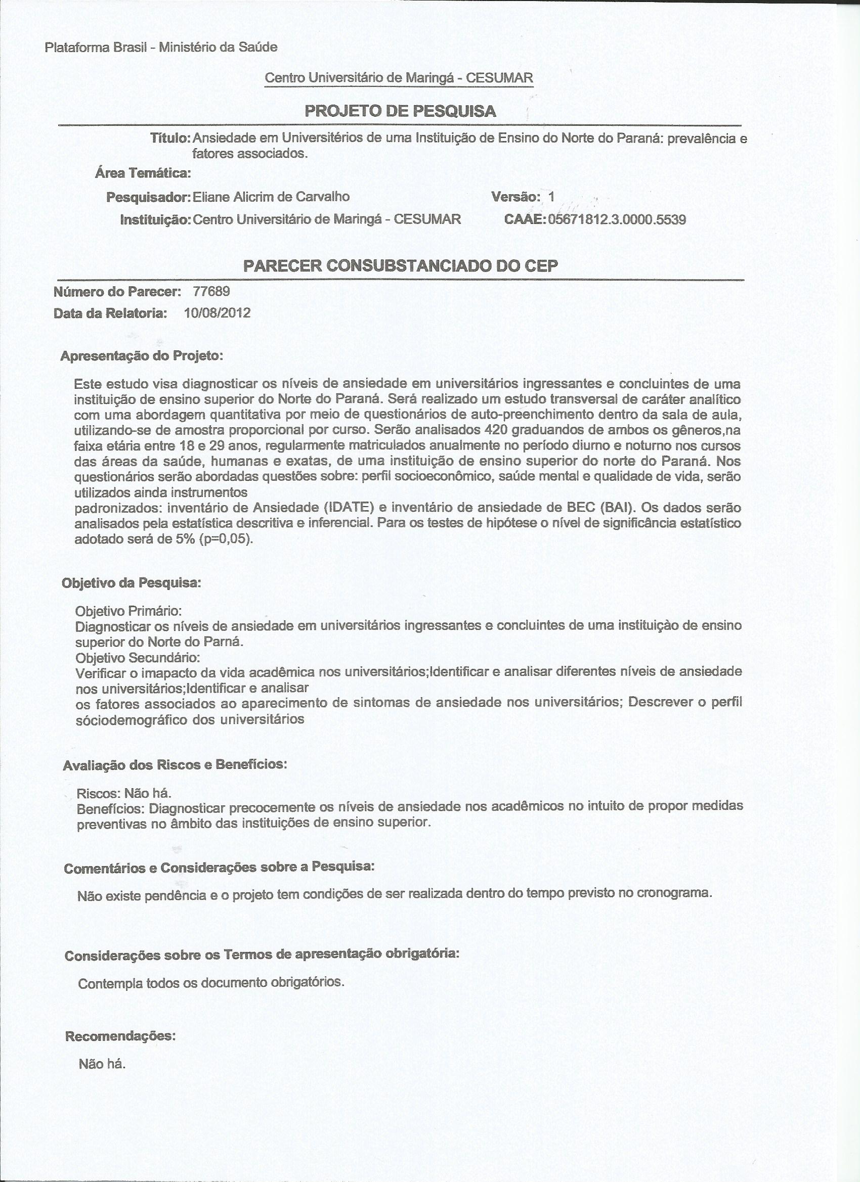 Índice de ansiedade em universitários ingressantes e concluintes de uma instituição de ensino superior/Anxiety scores in university entering and graduating students from a higher education institution