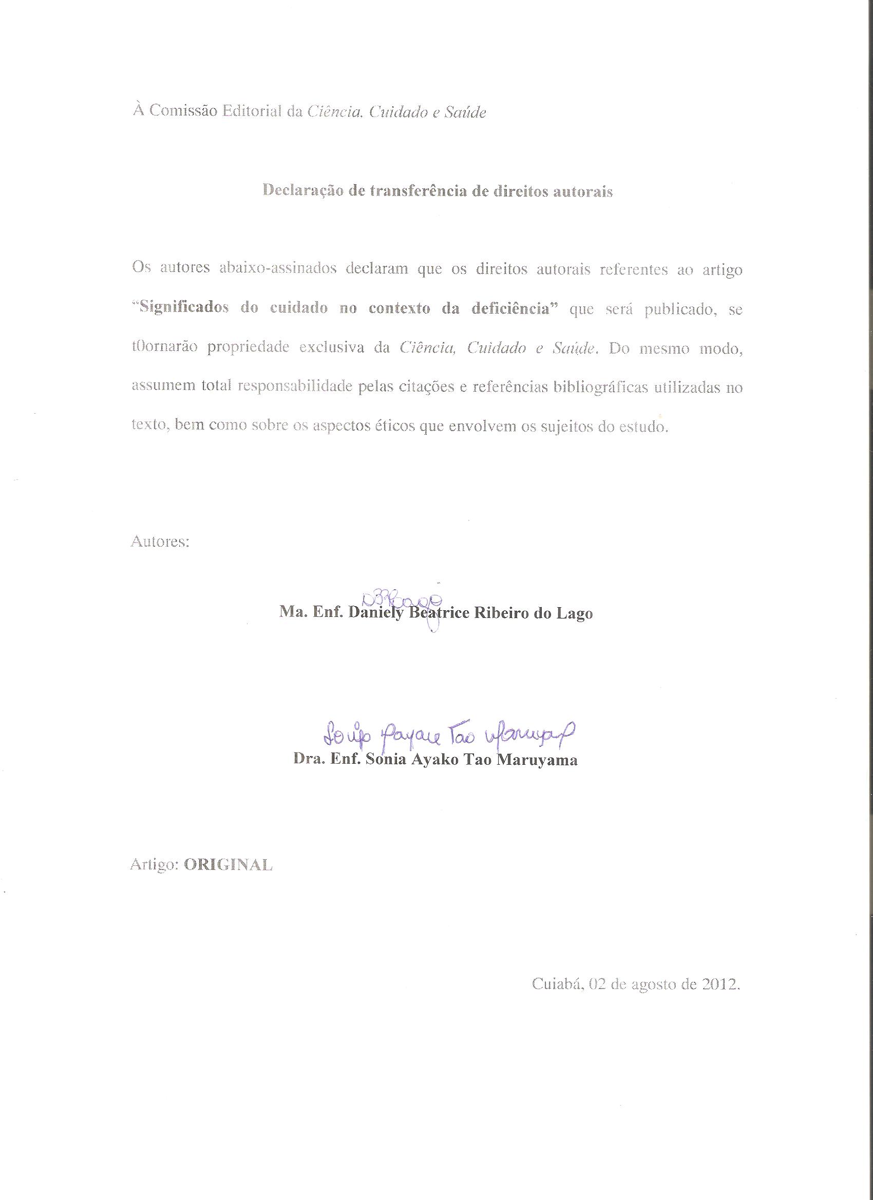 Resumo PDF - PORT PDF - ING Carta de submissão do manuscrito SIGNIFICADOS DO CUIDADO NO CONTEXTO DA DEFICIENCIA Declaração de transferencia de direitos autorais do manuscrito SIGNIFICADOS DO CUIDADO NO CONTEXTO DA DEFICIENCIA Parecer do Comite de Etica em Pesquisa Folha de Apresentação do Manuscrito -