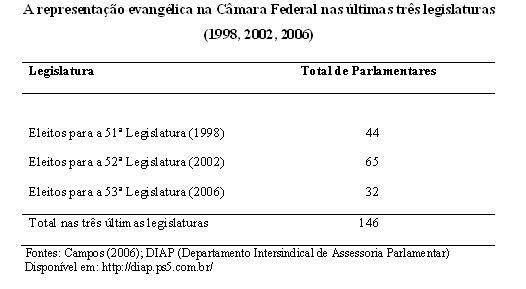 A proposta deste artigo consiste em realizar uma análise da atuação evangélica na política brasileira. O que entra em jogo no discurso deste “novo ator” político, qual a relação destes evangélicos com outras forças que compõem o ambiente eleitoral em períodos de efervescência política são questões a serem abordadas neste trabalho. Se nas eleições de 1998 foi identificada uma presença significativa no total de parlamentares eleitos, em 2002 este número atingiu o seu ápice, foram cerca de setenta evangélicos. No entanto, o mesmo não pode ser dito sobre a legislatura eleita em 2006, quando este número evidenciou uma queda drástica. O atual sistema político brasileiro contribui muito para este tipo de fenômeno, ou seja, a ascensão de políticos religiosos. O sistema partidário é muito frágil, os eleitores escolhem seus candidatos através de qualidades pessoais, e neste aspecto, 2010 não foi diferente.
