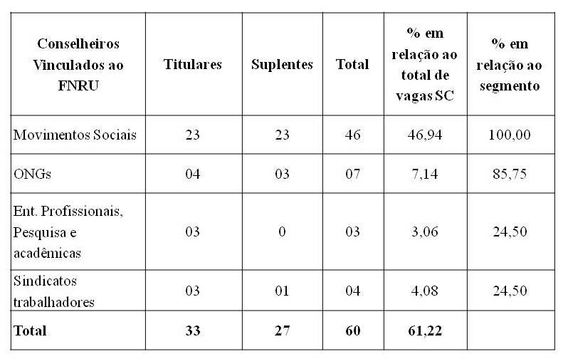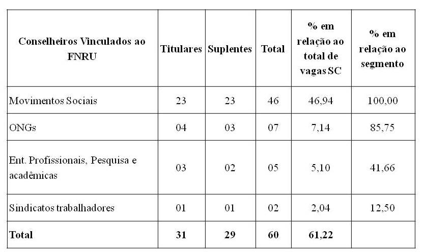 - Distribuição de Conselheiros vinculados ao FNRU no Conselho Nacional das Cidades. Gestão – 2008/2010