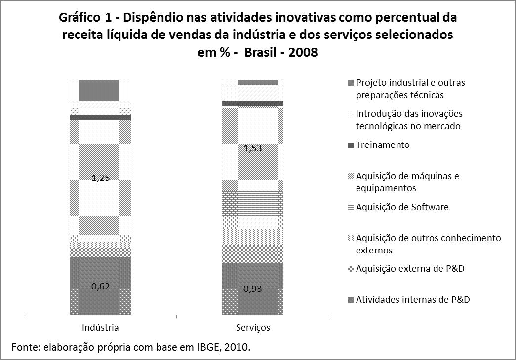 - Gráfico 1 - Dispêndio nas atividades inovativas como percentual da receita líquida de vendas da indústria e dos serviços selecionados em % - Brasil - 2008