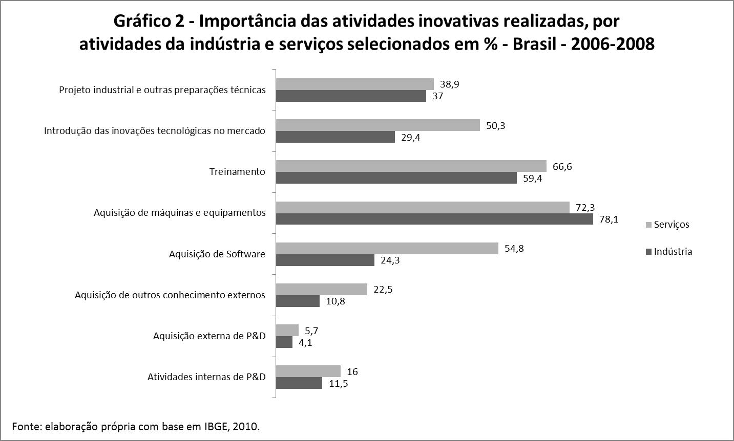 - Gráfico 2 - Importância das atividades inovativas realizadas, por atividades da indústria e serviços selecionados em % - Brasil - 2006-2008