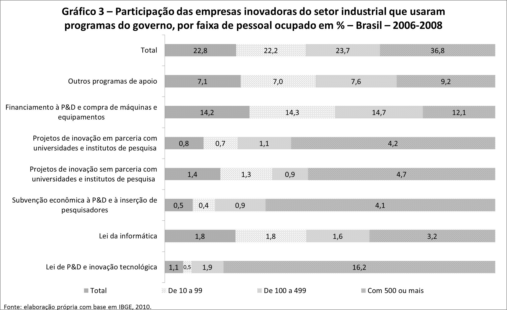 - Gráfico 3 - Participação das empresas inovadoras do setor industrial que usaram programas do governo, por faixa de pessoal ocupado em % - Brasil - 2006-2008
