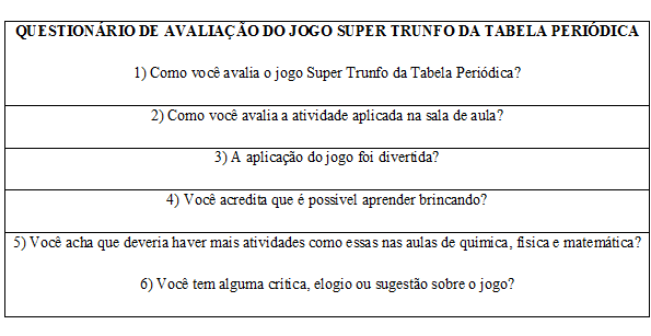 A química, muitas vezes, tem sido vista pelos alunos como uma disciplina abstrata, maçante e pouco convidativa. Não é possível retirar do conteúdo escolar toda a simbologia que faz parte da estruturação sistemática da química como uma ciência. No entanto, existem vários meios que podem ser empregados para atrair a atenção dos estudantes. São instrumentos didático-pedagógicos que facilitam a compreensão de conceitos, de fórmulas e de nomenclaturas, auxiliando na relação entre o ensino e a aprendizagem. Nesse contexto, o lúdico/jogo adequa-se perfeitamente como uma proposta para tornar esta disciplina mais interessante e divertida. Partindo dessa premissa, foi criado o jogo Super Trunfo da Tabela Periódica para servir como uma ferramenta no ensino de química nas séries iniciais do ensino médio das escolas estaduais do município de Presidente Epitácio, no interior de São Paulo, mostrando que o jogo pode ser motivador e envolvente ao mesmo tempo em que ensina.