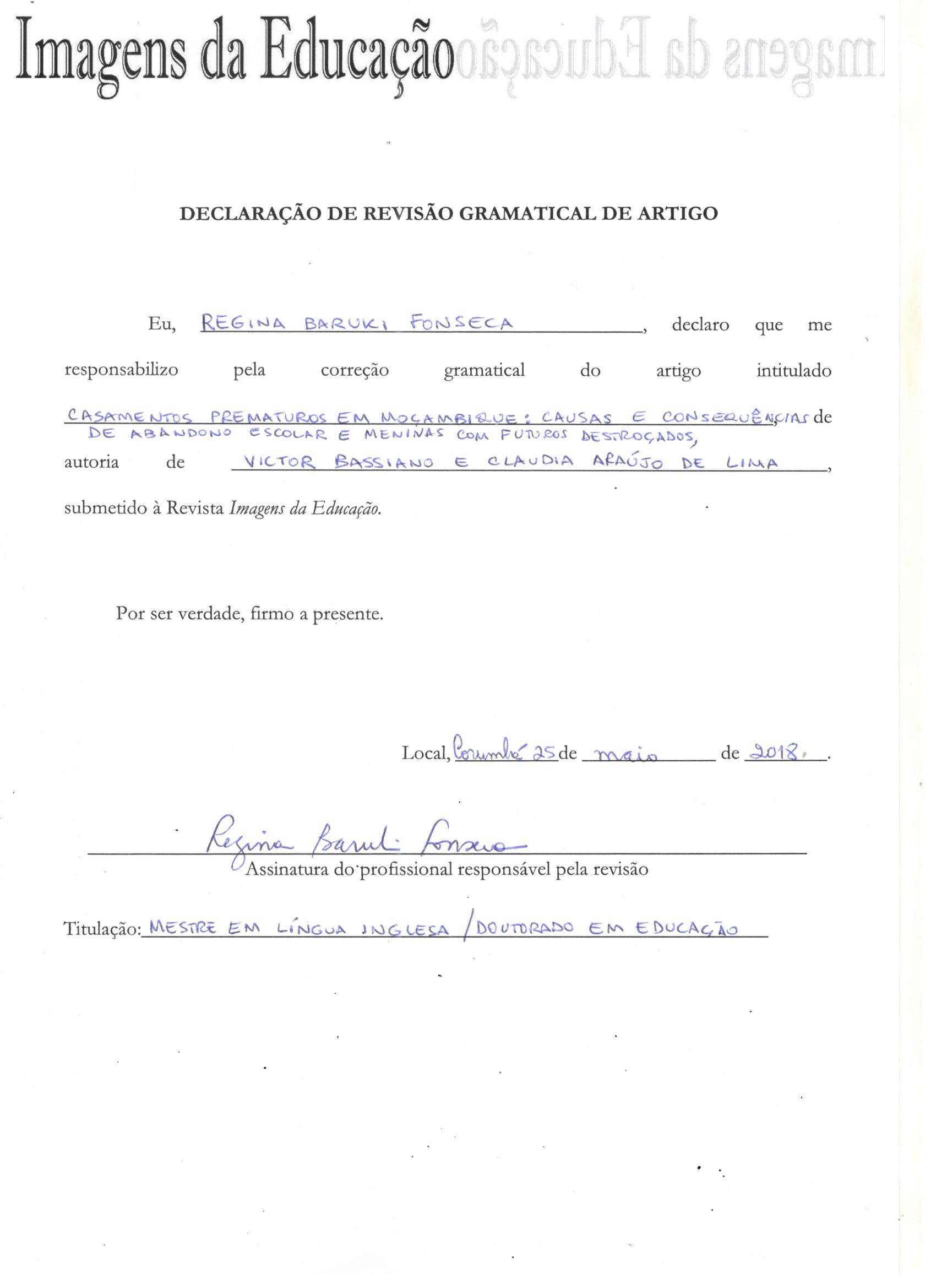 Declaro que o presente artigo é original, não tendo sido submetido à publicação em qualquer outro periódico nacional ou internacional, quer seja em parte ou em sua totalidade. Declaro, ainda, que uma vez publicado na revista Imagens da Educação,ele não será submetido por mim ou pelos demais co-autores a outro periódico. Por meio deste instrumento, em meu nome e dos co-autores, cedo os direitos autorais do referido artigo à Revista e declaro estar ciente de que a não observância deste compromisso submeterá o infrator a sanções e penas previstas na Lei de Proteção de Direitos Autorias (Nº 9609, de 19/02/98).