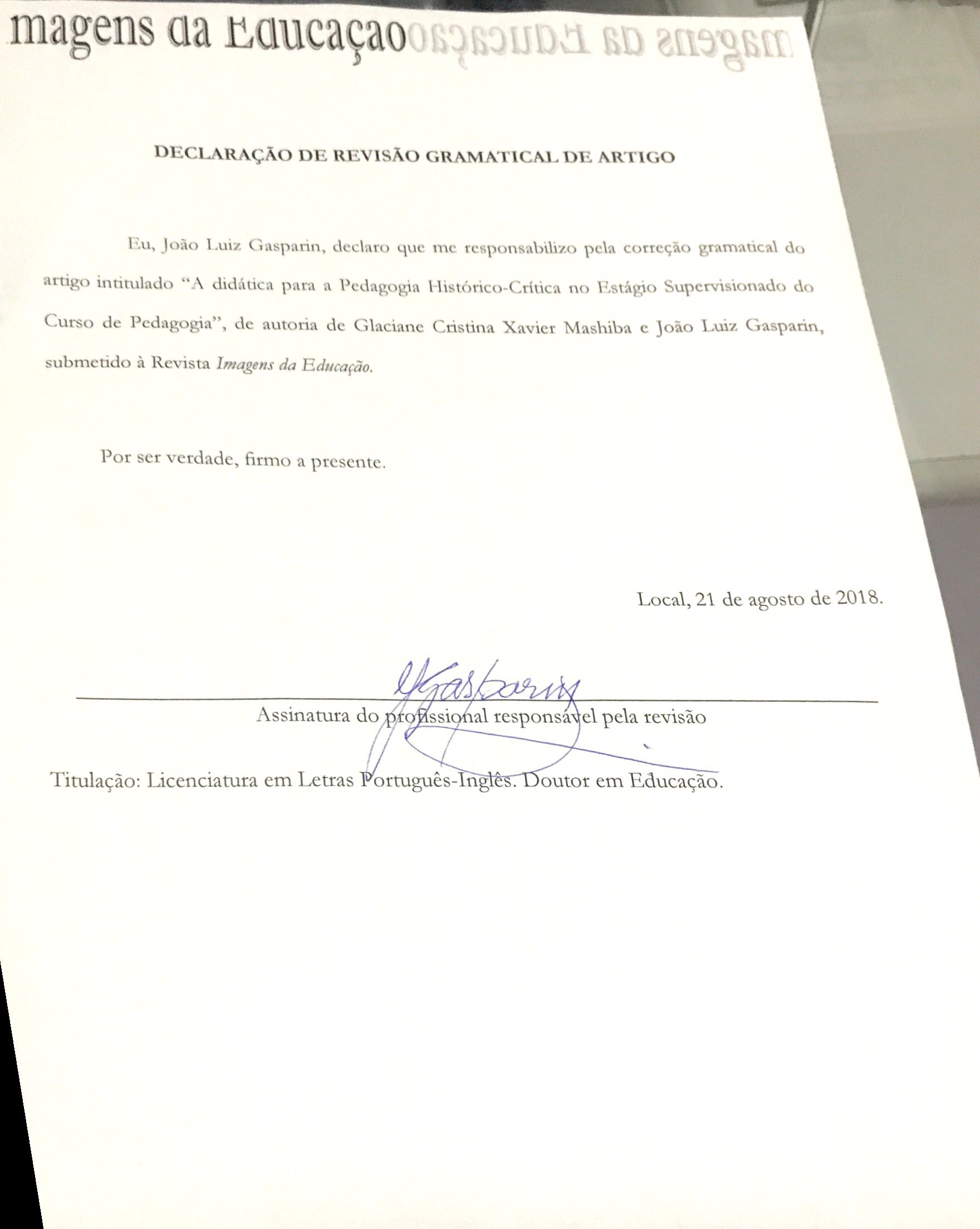 Declaro que o presente artigo é original, não tendo sido submetido à publicação em qualquer outro periódico nacional ou internacional, quer seja em parte ou em sua totalidade. Declaro, ainda, que uma vez publicado na revista Imagens da Educação,ele não será submetido por mim ou pelos demais co-autores a outro periódico. Por meio deste instrumento, em meu nome e dos co-autores, cedo os direitos autorais do referido artigo à Revista e declaro estar ciente de que a não observância deste compromisso submeterá o infrator a sanções e penas previstas na Lei de Proteção de Direitos Autorias (Nº 9609, de 19/02/98).