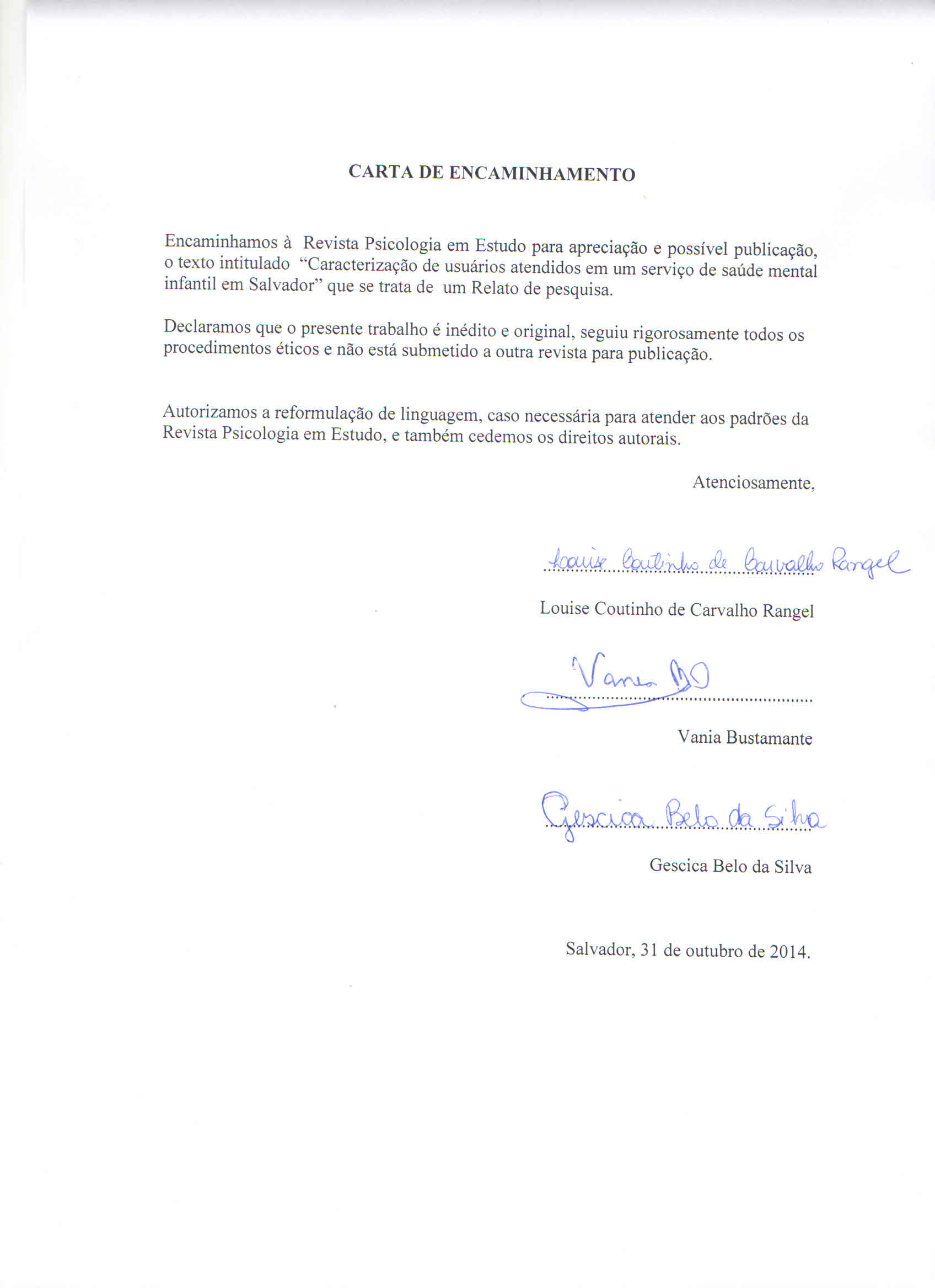 As opiniões emitidas, são de exclusiva responsabilidade do(s) autor(es). Ao submeterem o manuscrito ao Conselho Editorial de Psicologia em Estudo, o(s) autor(es) assume(m) a responsabilidade de não ter previamente publicado ou submetido o mesmo manuscrito por outro periódico. Em caso de autoria múltipla, o manuscrito deve vir acompanhado de autorização assinada por todos os autores. Artigos aceitos para publicação passam a ser propriedade da revista, podendo ser remixados e reaproveitados conforme prevê a licença Creative Commons CC-BY.