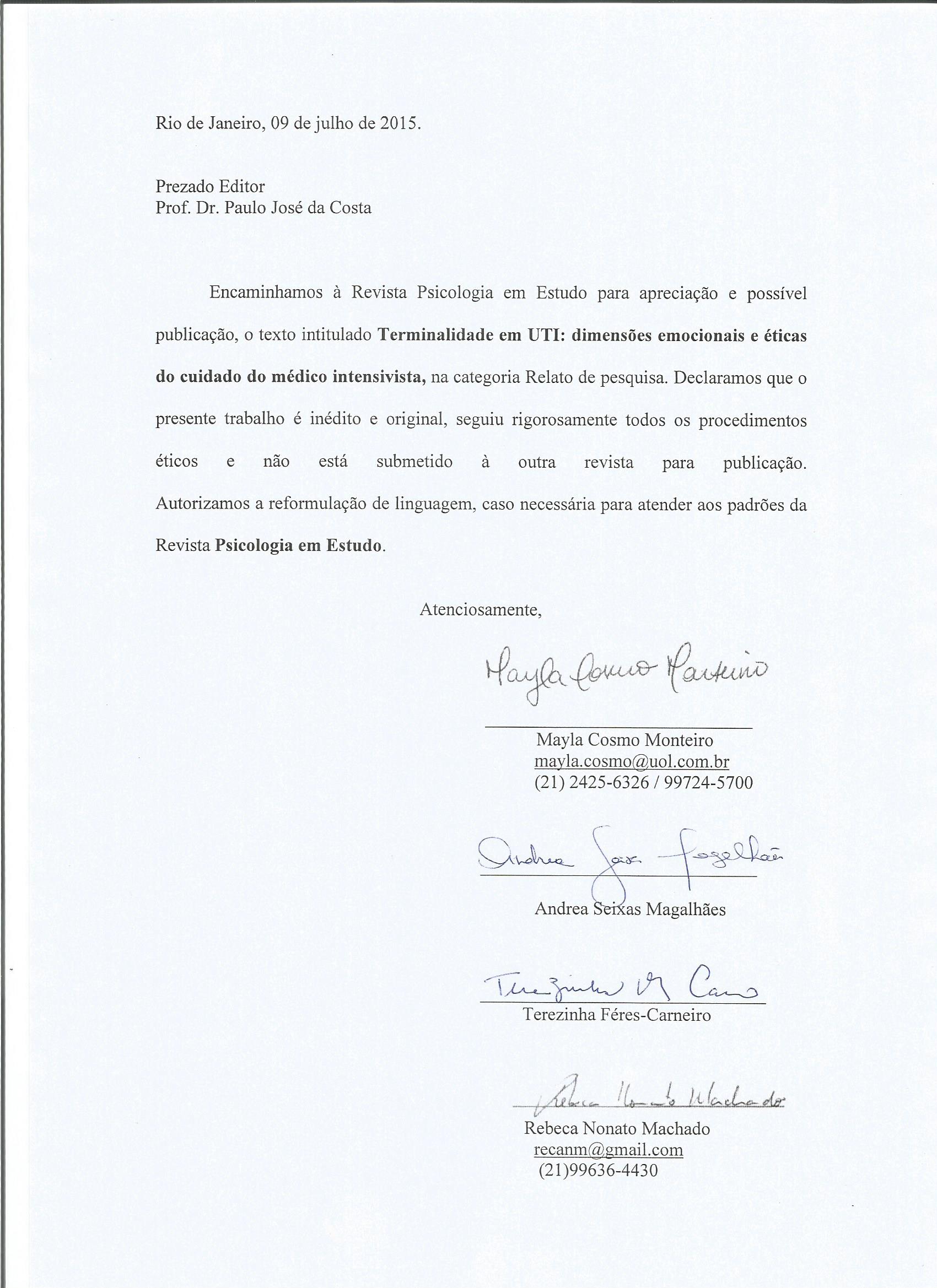 As opiniões emitidas, são de exclusiva responsabilidade do(s) autor(es). Ao submeterem o manuscrito ao Conselho Editorial de Psicologia em Estudo, o(s) autor(es) assume(m) a responsabilidade de não ter previamente publicado ou submetido o mesmo manuscrito por outro periódico. Em caso de autoria múltipla, o manuscrito deve vir acompanhado de autorização assinada por todos os autores. Artigos aceitos para publicação passam a ser propriedade da revista, podendo ser remixados e reaproveitados conforme prevê a licença Creative Commons CC-BY.