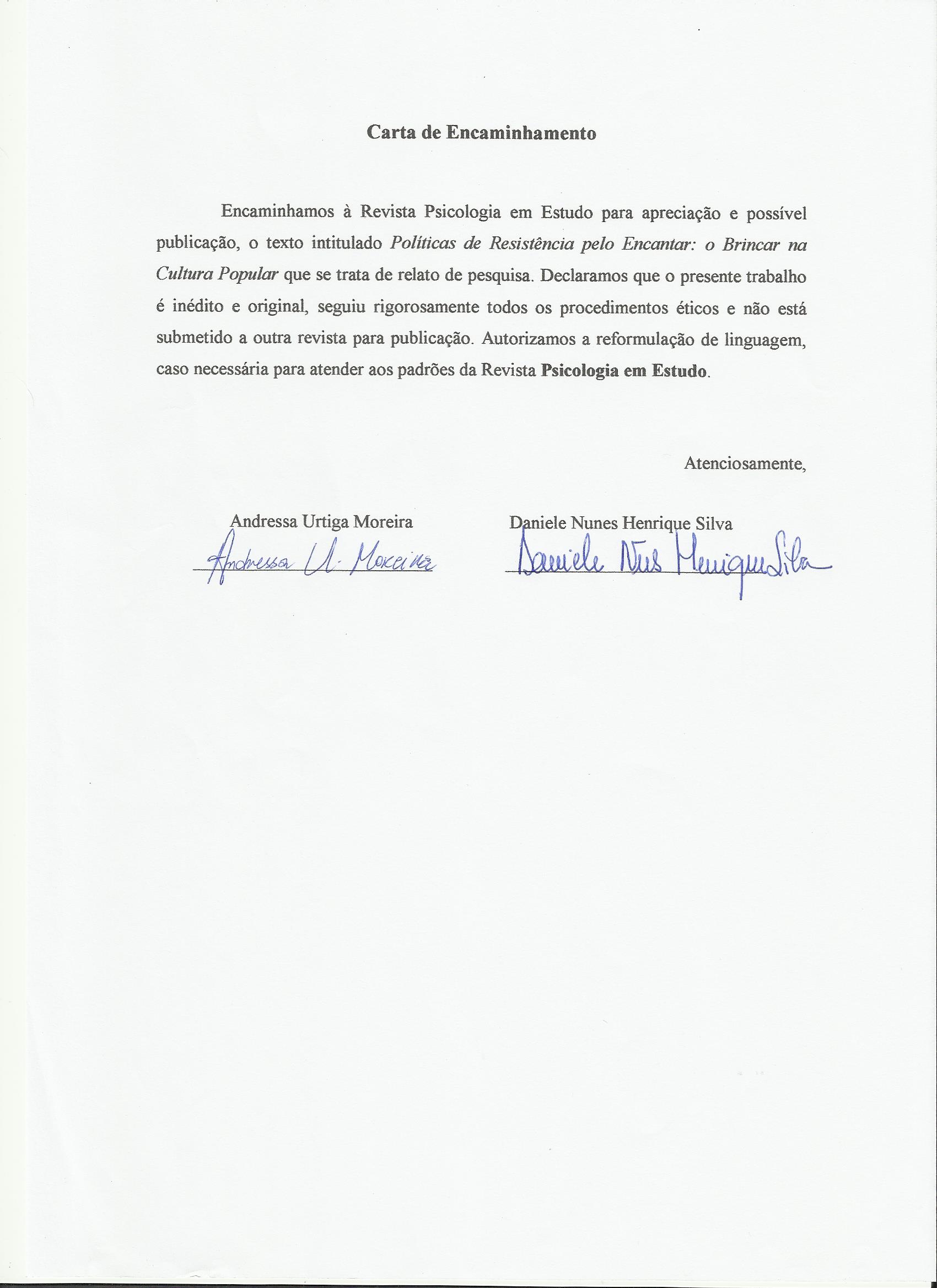 As opiniões emitidas, são de exclusiva responsabilidade do(s) autor(es). Ao submeterem o manuscrito ao Conselho Editorial de Psicologia em Estudo, o(s) autor(es) assume(m) a responsabilidade de não ter previamente publicado ou submetido o mesmo manuscrito por outro periódico. Em caso de autoria múltipla, o manuscrito deve vir acompanhado de autorização assinada por todos os autores. Artigos aceitos para publicação passam a ser propriedade da revista, podendo ser remixados e reaproveitados conforme prevê a licença Creative Commons CC-BY.