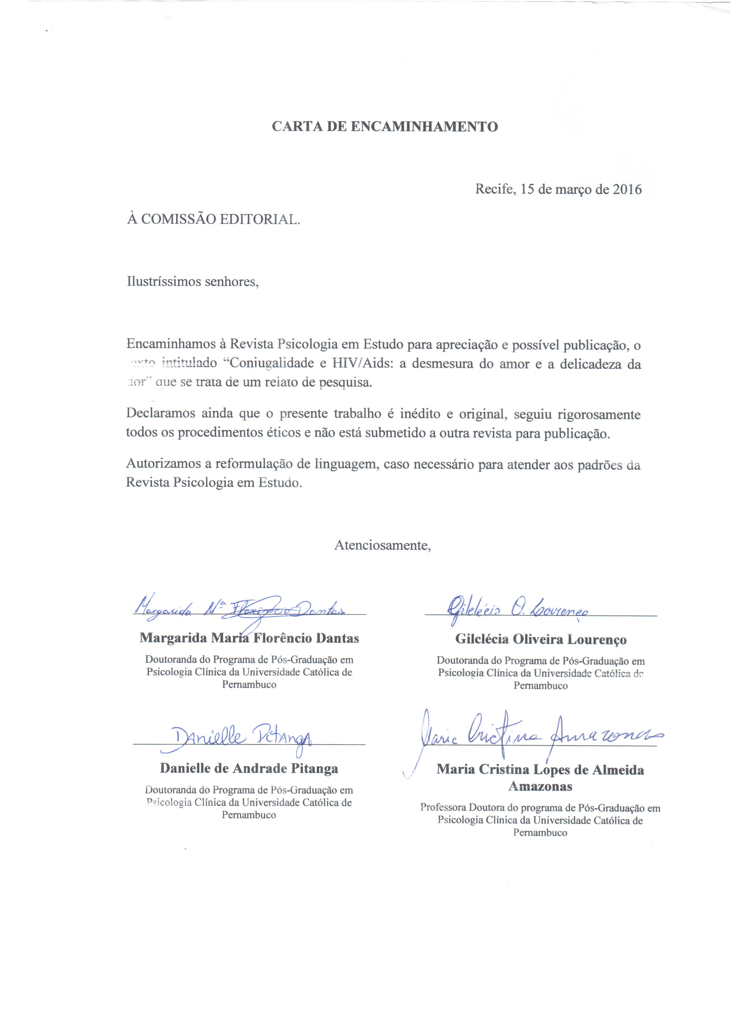 As opiniões emitidas, são de exclusiva responsabilidade do(s) autor(es). Ao submeterem o manuscrito ao Conselho Editorial de Psicologia em Estudo, o(s) autor(es) assume(m) a responsabilidade de não ter previamente publicado ou submetido o mesmo manuscrito por outro periódico. Em caso de autoria múltipla, o manuscrito deve vir acompanhado de autorização assinada por todos os autores. Artigos aceitos para publicação passam a ser propriedade da revista, podendo ser remixados e reaproveitados conforme prevê a licença Creative Commons CC-BY.