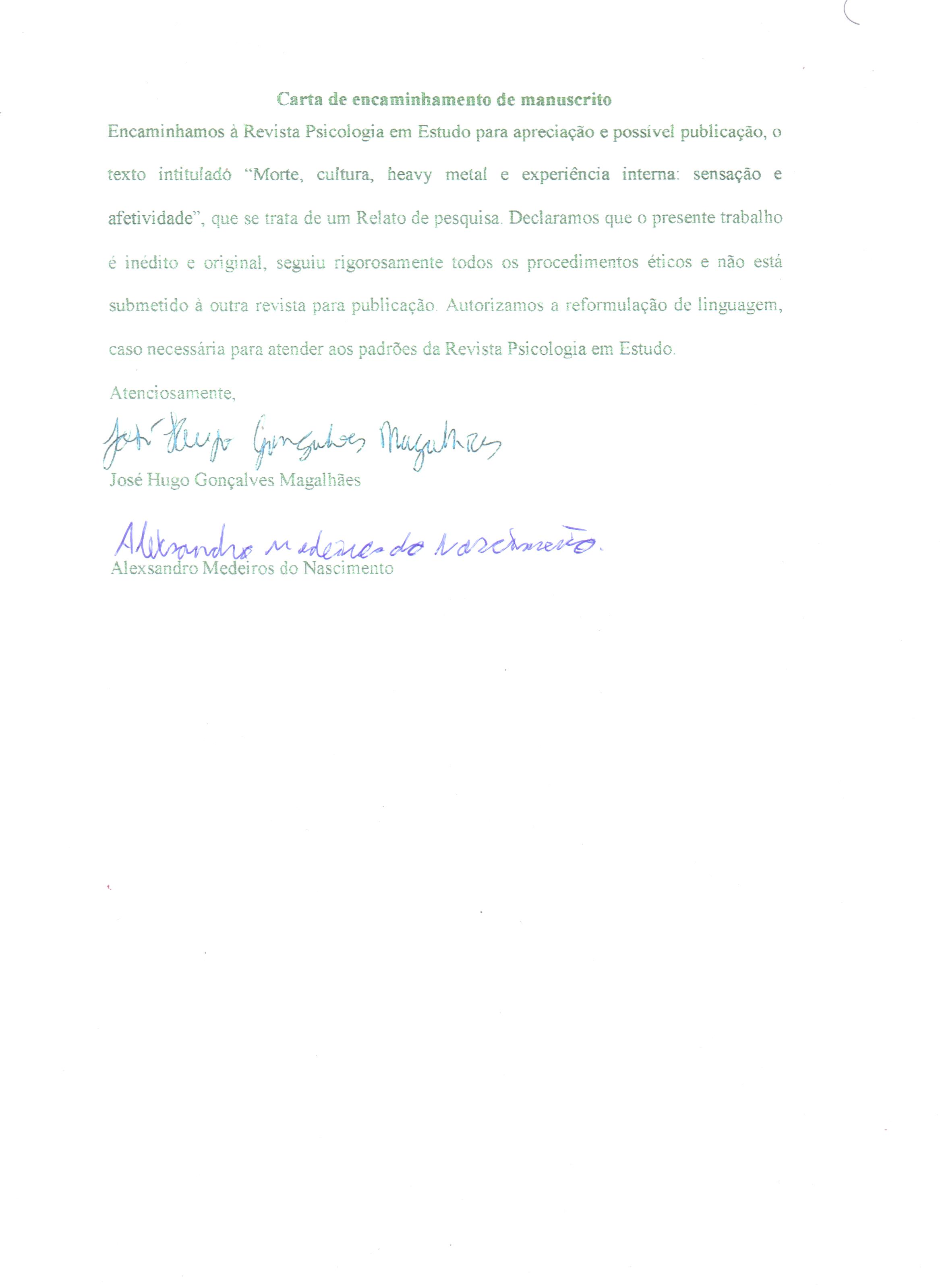 Magalhães, J.H.G. (2014). O que as pessoas experienciam quando a morte vem à mente? Explorando aspectos cognitivos e fenomenais da experiência interna dirigida à morte entre sujeitos inseridos na cultura heavy metal. Dissertação de Mestrado Não-Publicada, Programa de Pós-graduação em Psicologia Cognitiva, Universidade Federal de Pernambuco, Recife.