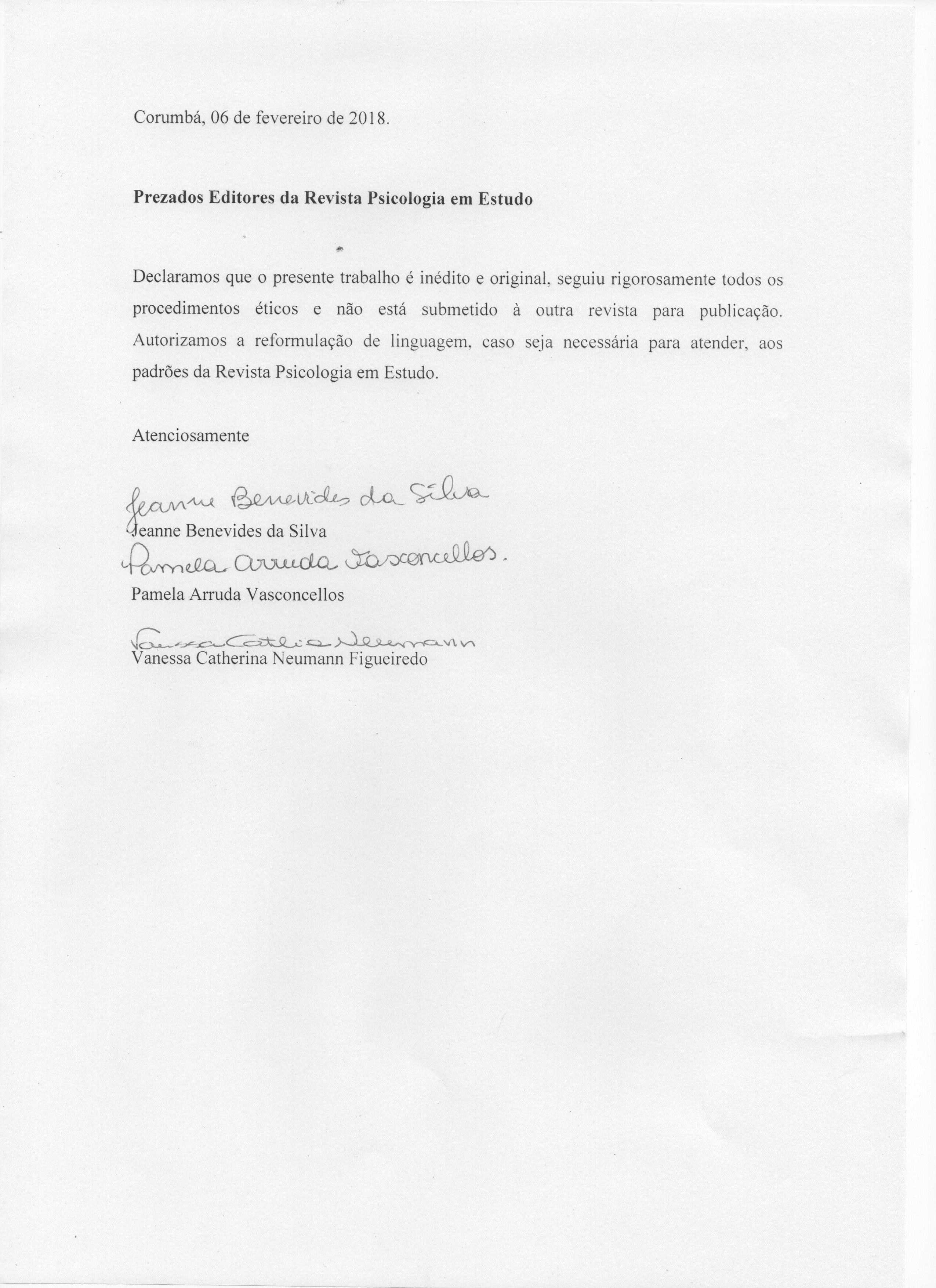 As opiniões emitidas, são de exclusiva responsabilidade do(s) autor(es). Ao submeterem o manuscrito ao Conselho Editorial de Psicologia em Estudo, o(s) autor(es) assume(m) a responsabilidade de não ter previamente publicado ou submetido o mesmo manuscrito por outro periódico. Em caso de autoria múltipla, o manuscrito deve vir acompanhado de autorização assinada por todos os autores. Artigos aceitos para publicação passam a ser propriedade da revista, podendo ser remixados e reaproveitados conforme prevê a licença Creative Commons CC-BY.