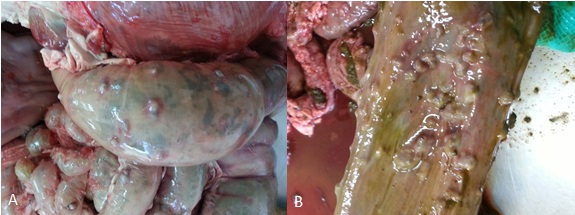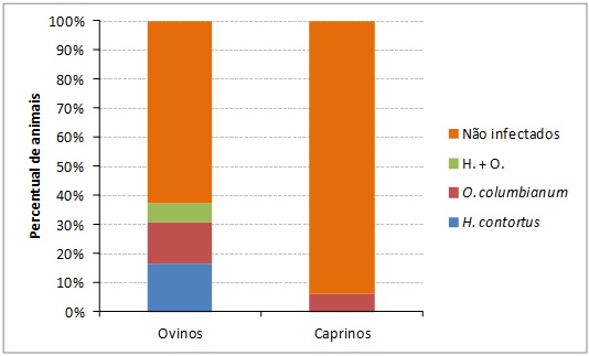 Avaliou-se a prevalência dos helmintos das espécies Haemonchus contortus e Oesophagostomum columbianum, em pequenos ruminantes, através de análise macroscópica durante a necropsia e confirmação por estereoscopia. Foram analisados 78 ovinos e 17 caprinos, totalizando 95 animais, que foram submetidos à necropsia no Laboratório de Anatomia Patológica da Universidade Estadual de Maringá, no período entre agosto de 2007 e setembro de 2014. Os resultados revelaram a presença do parasita em 32,63% dos animais. Além disso, observou-se que 16,66% dos ovinos e nenhum dos caprinos apresentavam somente o verme H. contortus e que 14,10% dos ovinos e 5,88% dos caprinos apresentavam somente O. columbianum, enquanto que, a presença de ambos parasitas no mesmo animal correspondeu a 6,3%. Desta forma, concluiu-se que houve evidências de maior prevalência do helminto H. contortus do que O. columbianum em ambas as espécies.Downloads