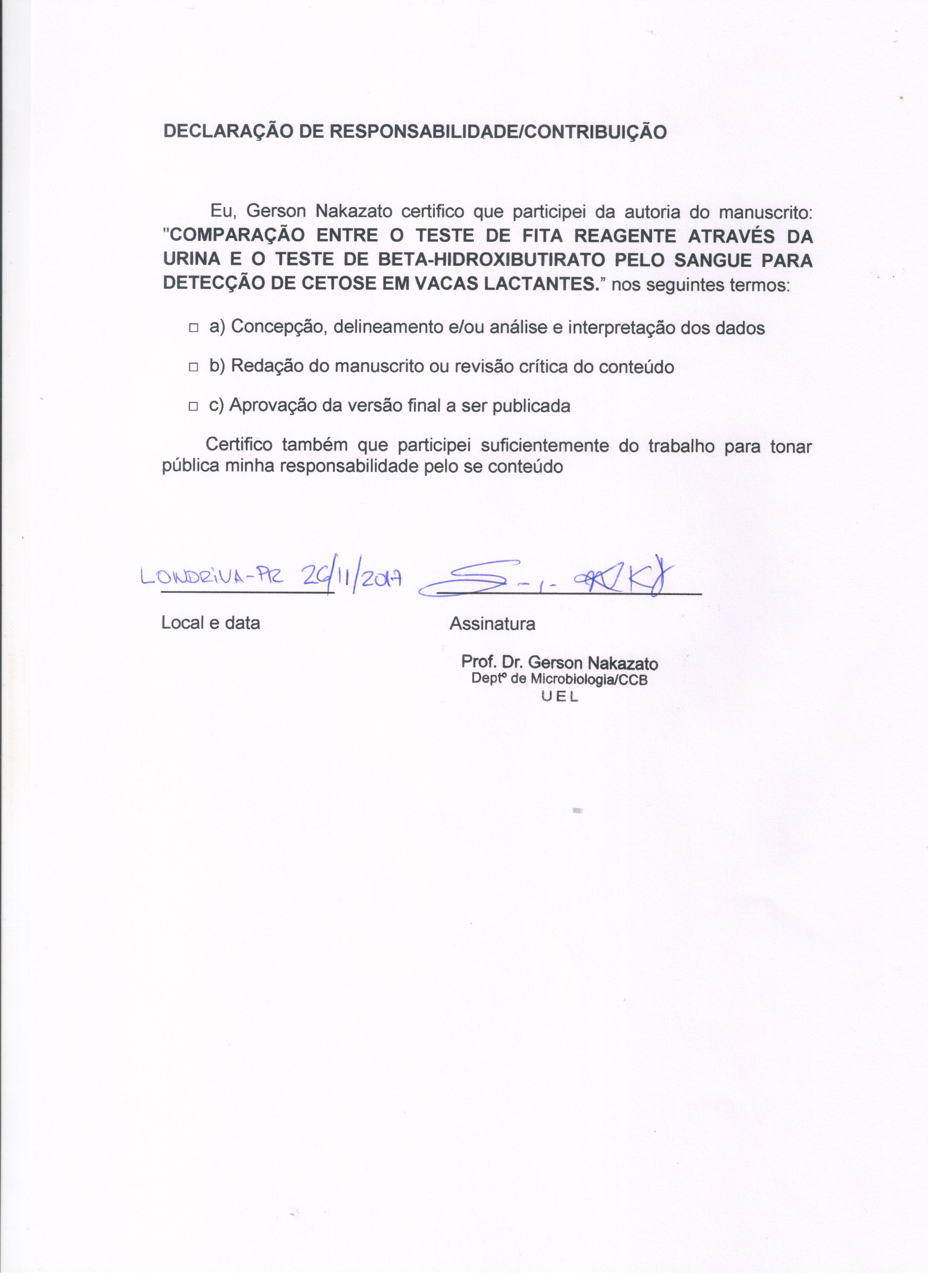 CAMPOS, R.; GONZÁLEZ, F.; COLDEBELLA, A.; LACERDA, L. Determinação de corpos cetônicos na urina como ferramenta para o diagnóstico rápido de cetose subclínica bovina e relação com a composição do leite. Archives of Veterinay Science, v. 10, n. 2, 2005 p. 49-54.