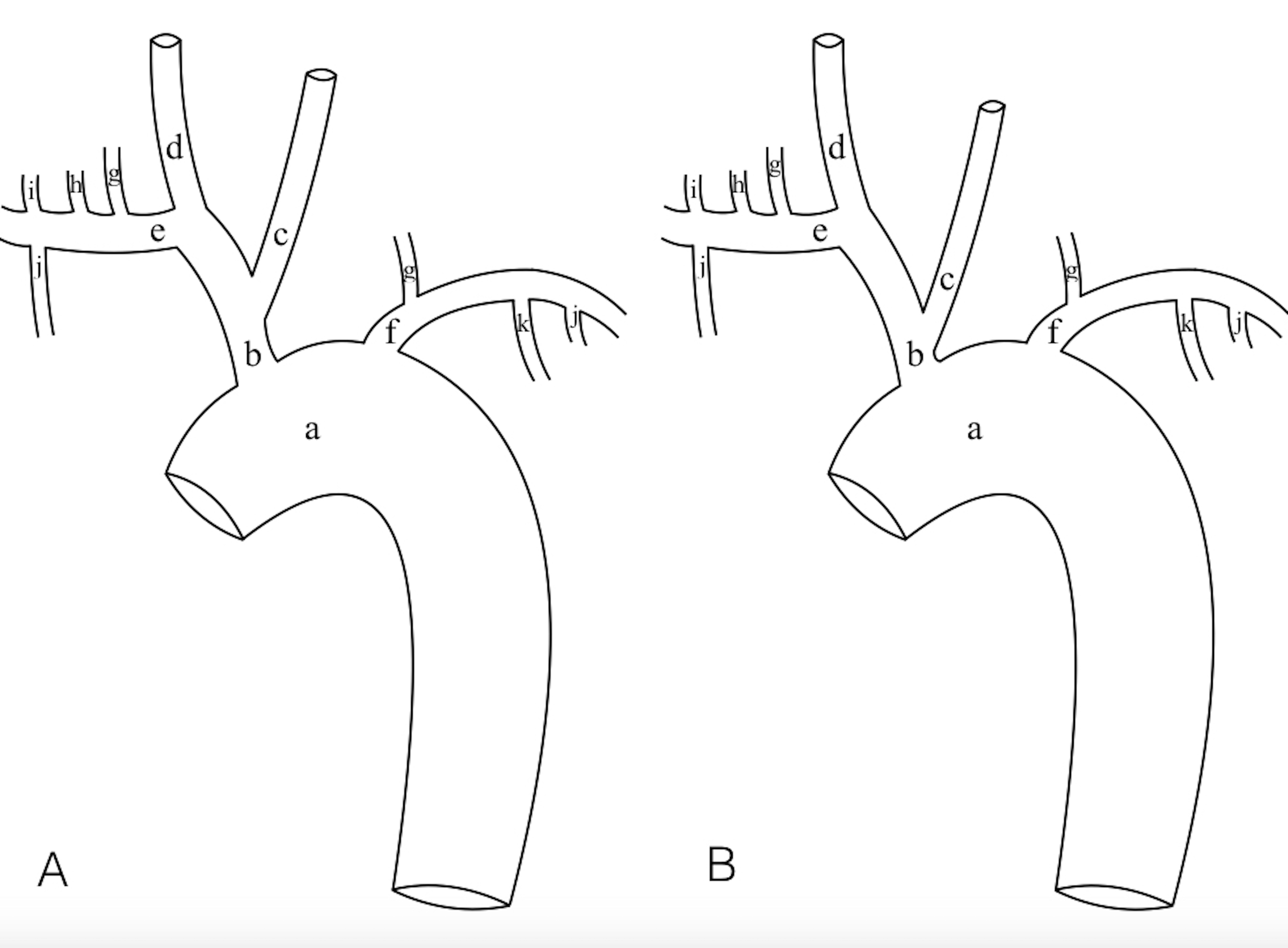 O presente estudo tem como objetivo sistematizar e descrever os ramos do arco aórtico e suas respectivas ramificações em coelhos da raça Nova Zelândia, estabelecendo um modelo padrão e suas principais variações anatômicas.Foram usados 16 coelhos adultos (Oryctologus cuniculus) da raça New Zeland, com massa corpórea de 2-3 kg e com 10-12 meses. Os animais foram submetidos à  associação de Cetamina (70 mg/kg) e Xilazina (10 mg/kg) por via subcutânea. Posteriormente, realizou-se a heparinização com 5000 UI por meio da artéria femoral. Foi aguardado 10 minutos e seguiu-se com a eutanásia do animal usando sobredose da associação anestésica. Após, seguiu-se com a abertura da cavidade torácica. A aorta dos coelhos iniciou a partir do ventrículo esquerdo com um diâmetro médio de 5,4 ±0,6mm em seu maior eixo. Tal artéria projetou-se dorso-crânio-lateralmente à esquerda, em todos os animais estudados, formando o arco aórtico. O tronco arterial braquiocefálico apresentou um diâmetro de 3,8 ±0,4mm em sua eminência. Foram identificados dois padrões de saída da artériacarótida comum esquerda. No padrão mais frequente (75%) este vaso surgia milímetros após a eminência do tronco e o modelo variante (25%) o mesmo vaso surgia após 0,4-0,6mm da base do tronco. Este trabalho observou o padrão de origem da aorta no ventrículo esquerdo, tendo ascensão dorso-crânio-lateral esquerda e posterior deflexão caudal. Observou-se uma grande variação anatômica nos ramos originados das artérias subclávias, não sendo possível uma padronização uniforme.