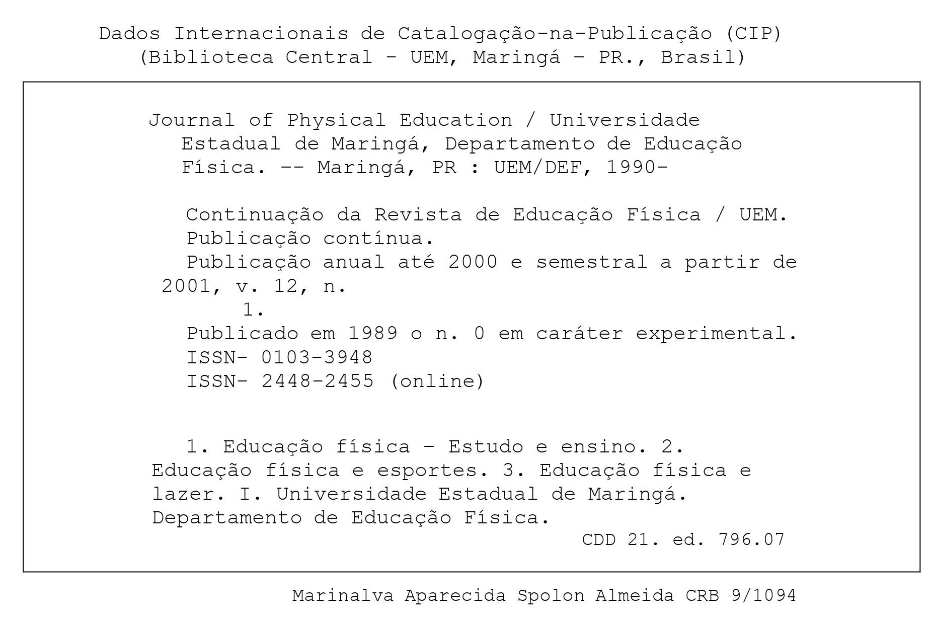 The Journal of Physical Education is published continuously with articles being published both in English and Portuguese.